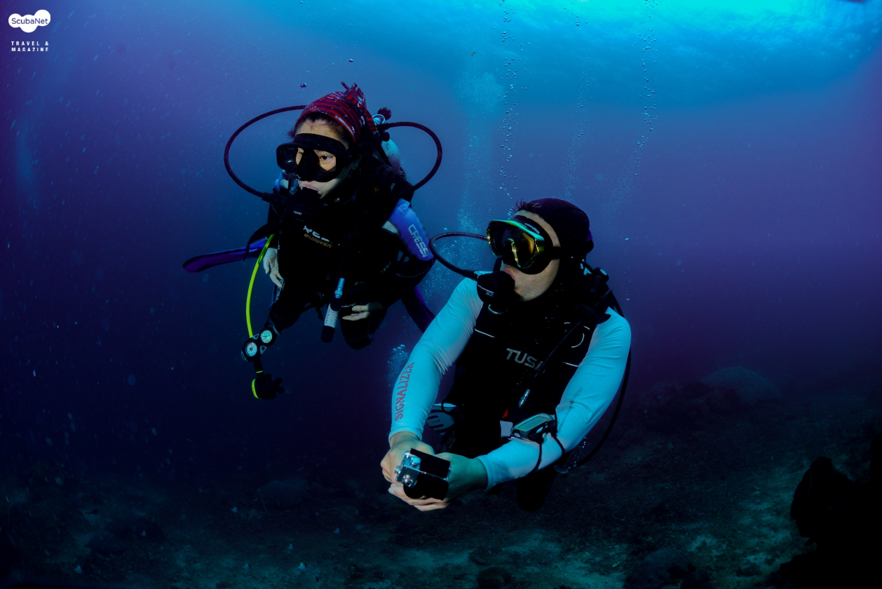 누사페니다의 산호군락 위로 초보 다이버를 이끌고 흘러가는 가이드