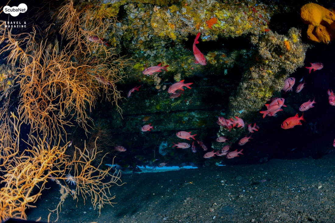 난파선의 구석진 곳에 모여 있는 솔저피쉬들