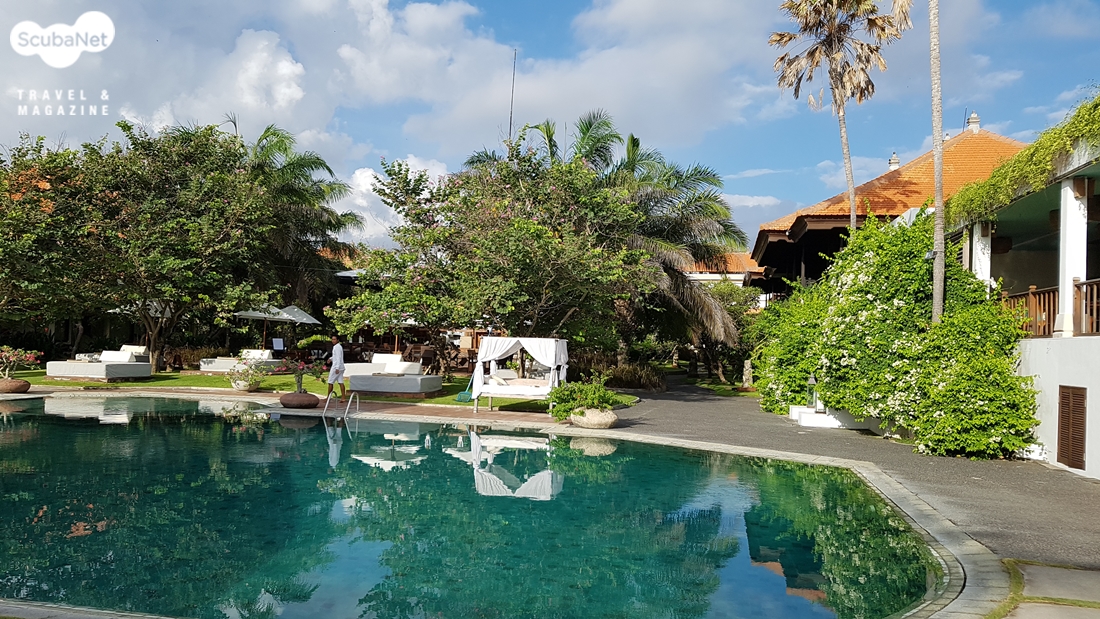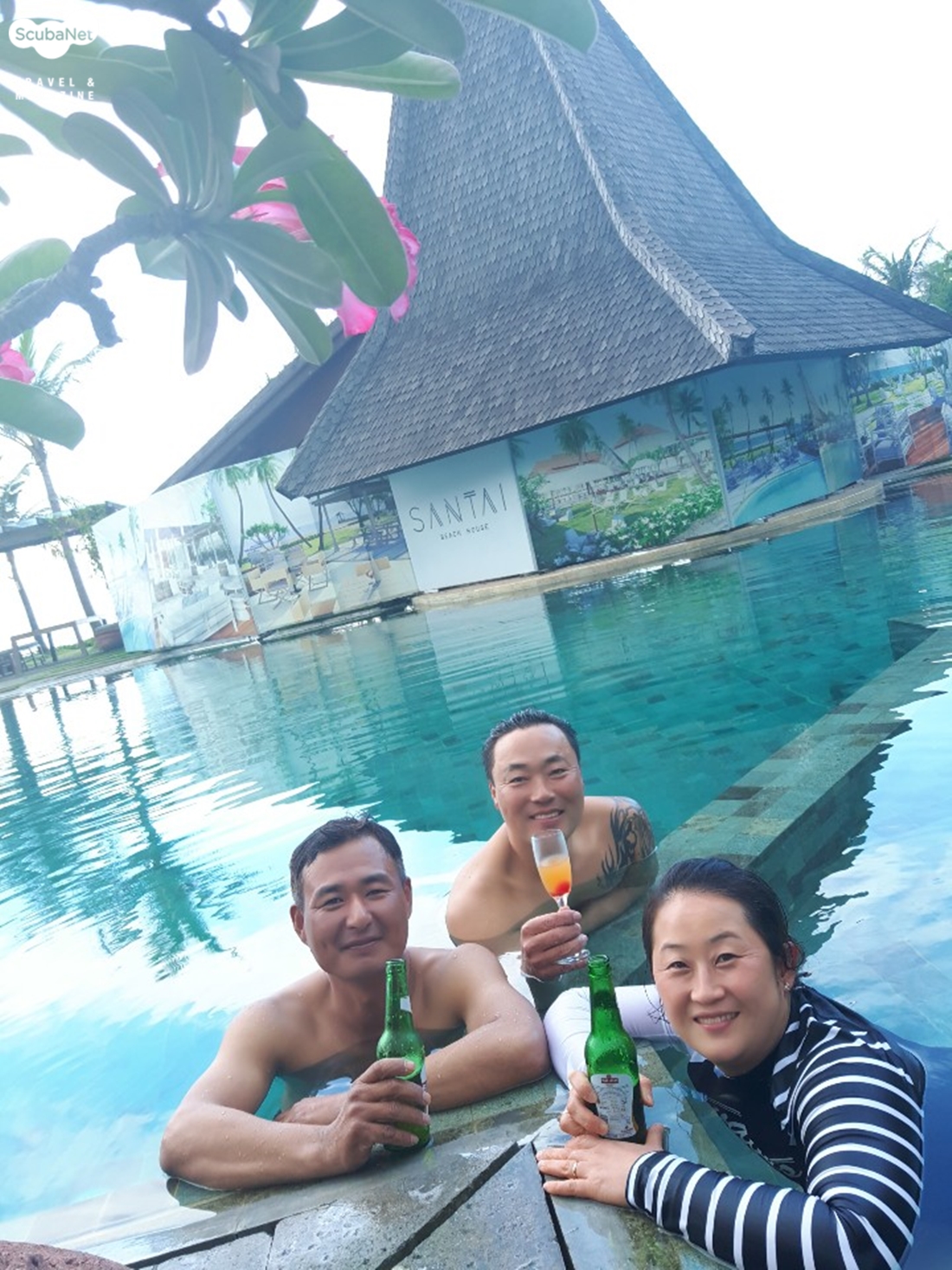 사드라 리조트의 수영장에서 쉬고 있는 다이버들