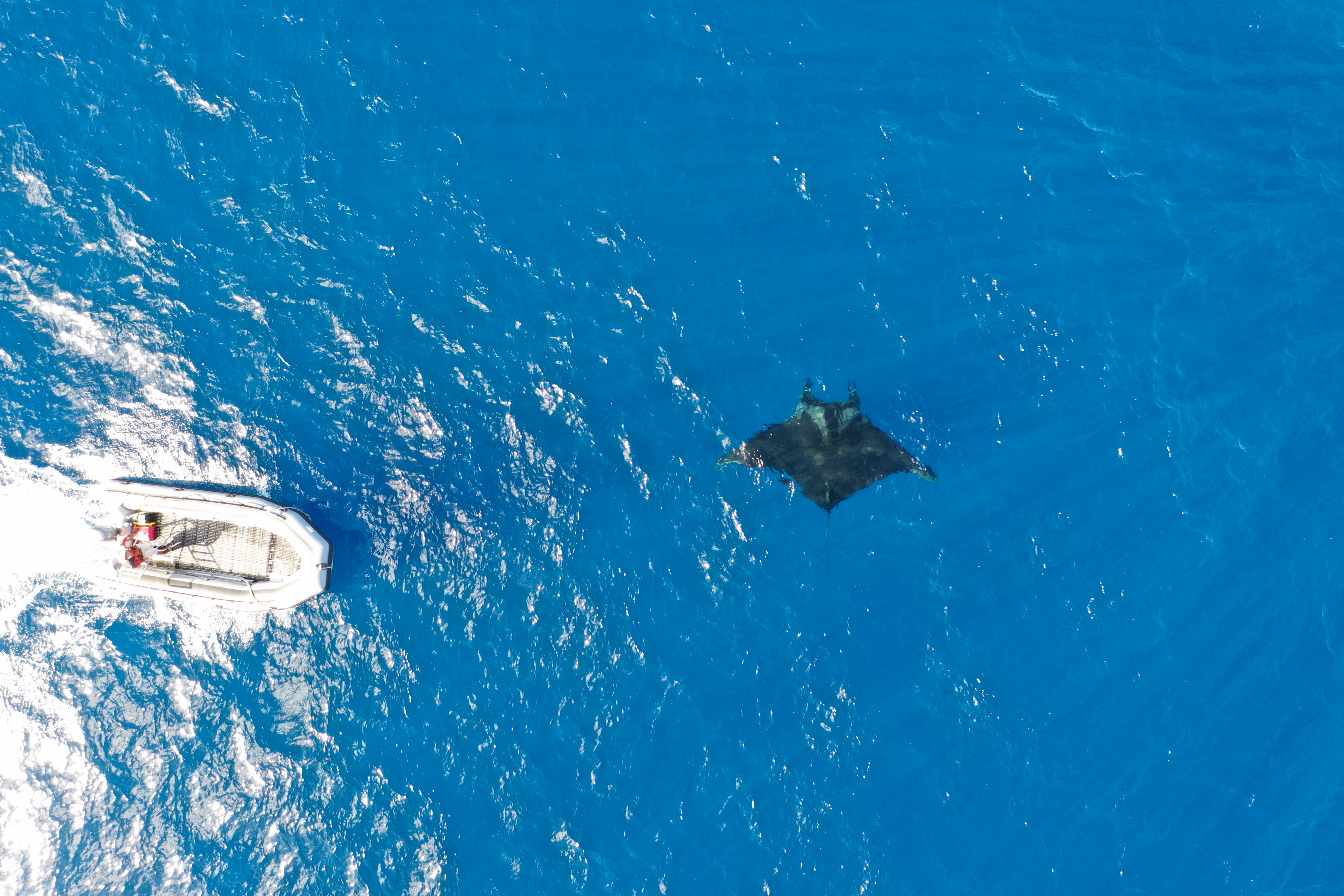 수면 근처에 있는 거대한 만타레이와 지나가는 고무보트