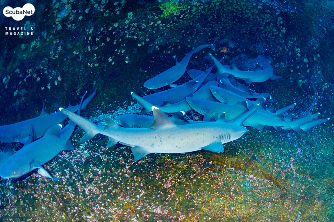 절벽의 바위 턱에 몰려서 쉬고 있는 화이트팁 리프 상어들