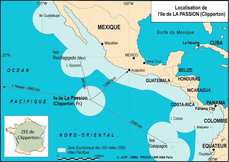 동태평양의 빅3 포인트 위치. 프랑스령 클리퍼톤 섬을 중심으로 한 지도이다.