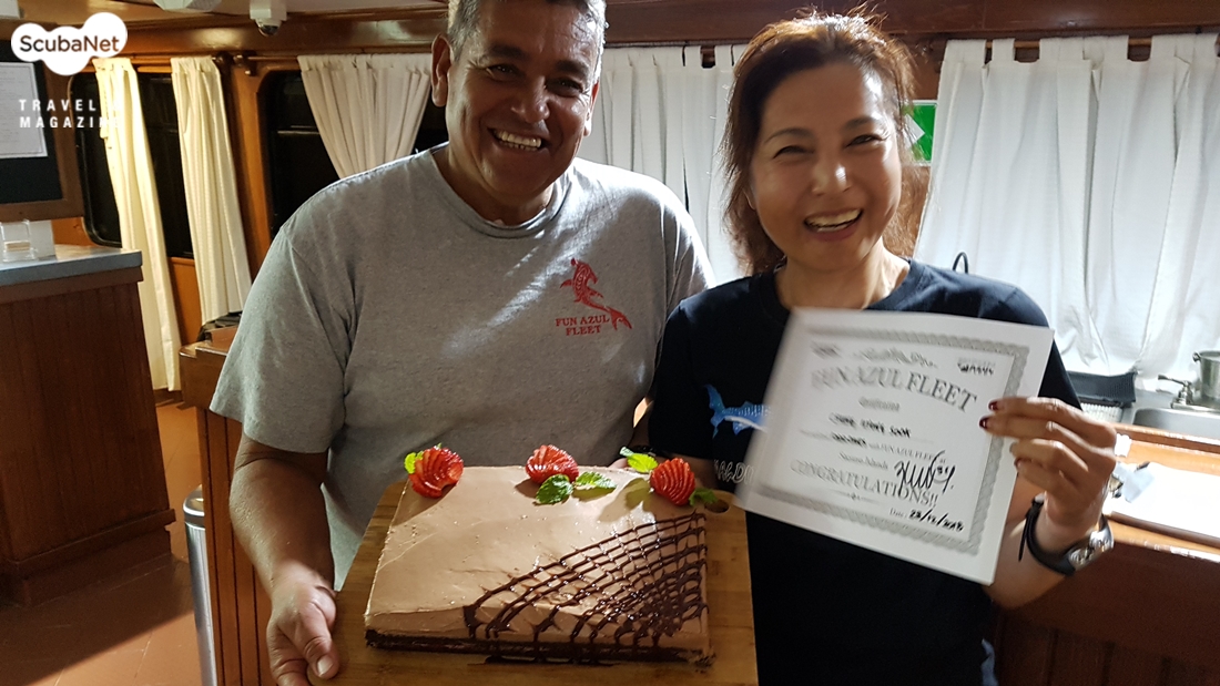 1,000회 기념 인증서와 축하 케익을 받은 정형숙 다이버