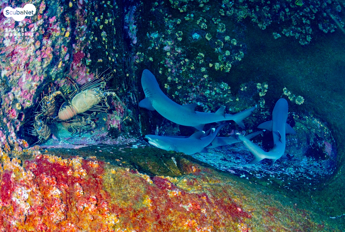 실버팁 상어바위의 구석진 곳에는 화이트팁 상어들이 앉아서 쉬고 있는 모습이 흔하게 보였는데 이들이 많은 곳에서는 한꺼번에 20마리 이상이 모여 있기도 했다. 재미있는 것은 상어들이 쉬고 있는 곳에 바닷가재들도 같이 모여 있었던 것이다. 상어들이 바닷가재를 먹이로 할 만한데도 같은 곳에서 서식하는 것이 신기했는데 바닷가재들의 크기가 상어들이 잡을 수 없을 정도로 컸다는데 의미가 있을 것 같았다.