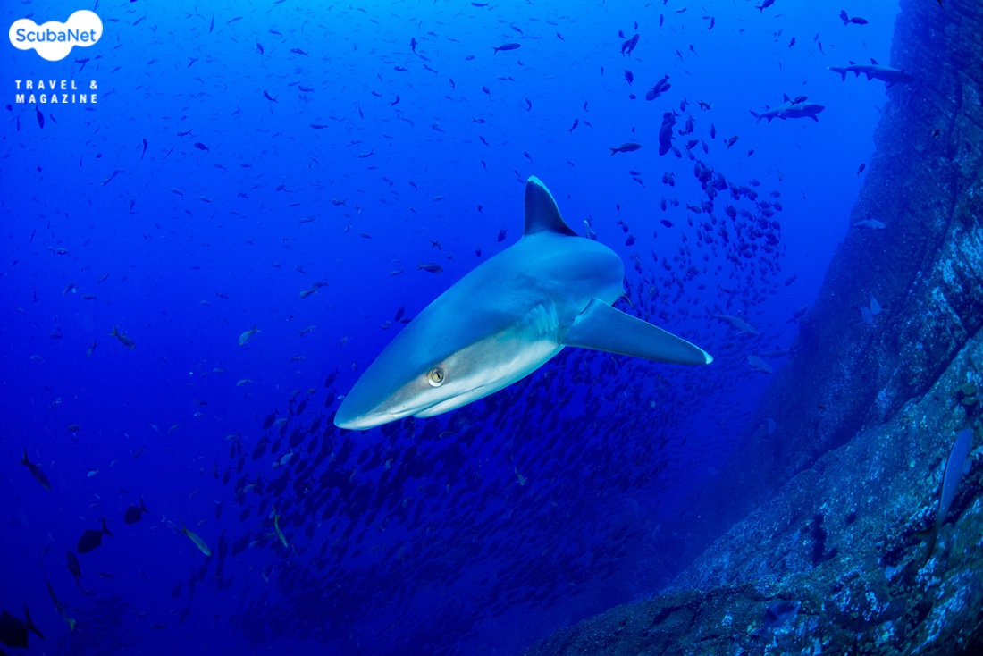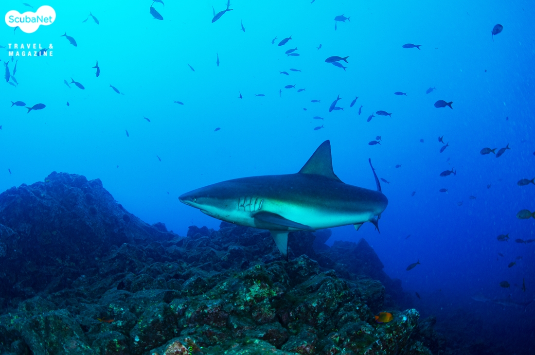 세번째 다이빙에서는 클리닝스테이션으로 갔다. 가는 길에 덩치 큰 더스키 상어를 보았고, 클리닝 스테이션에서는 실버팁 상어 무리들이 선회하고 있었다. 클리닝 스테이션에 머물고 있는 바버피쉬들을 찾아 갈라파고스 상어들도 왔다갔다 했다.