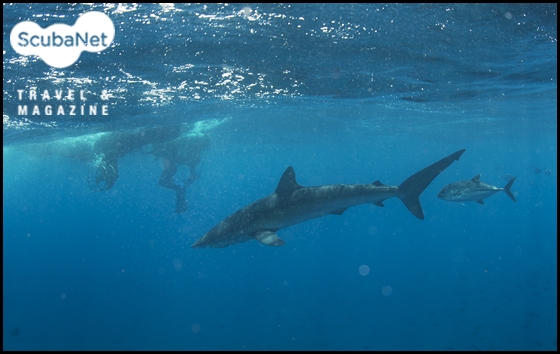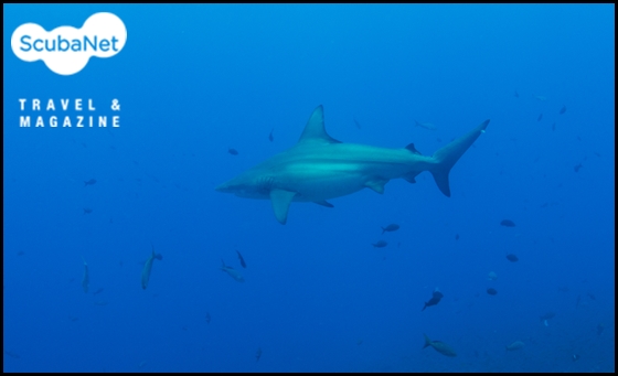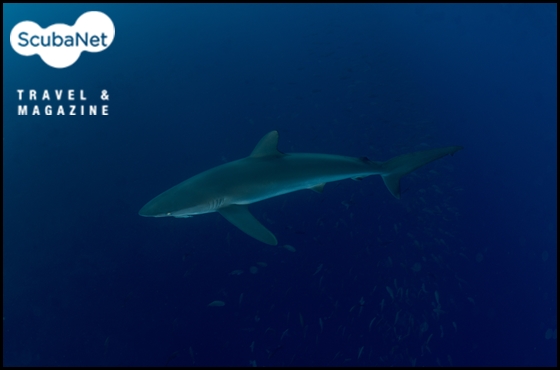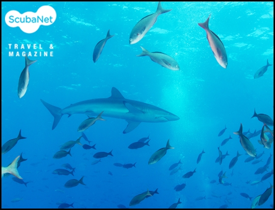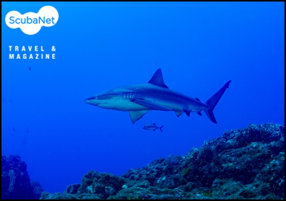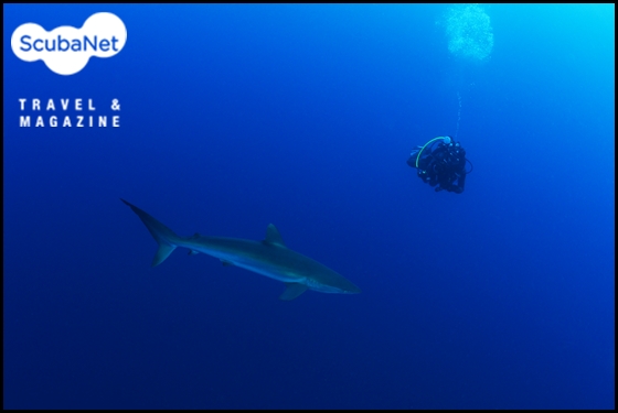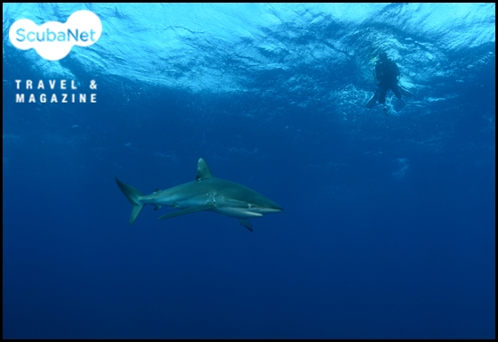 다이빙을 마치고 수면으로 상승할 때 나타난 실크 상어. 갈라파고스.