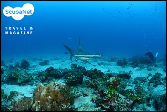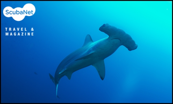 머리 위로 지나가는 홍살귀상어. 갈라파고스 섬
