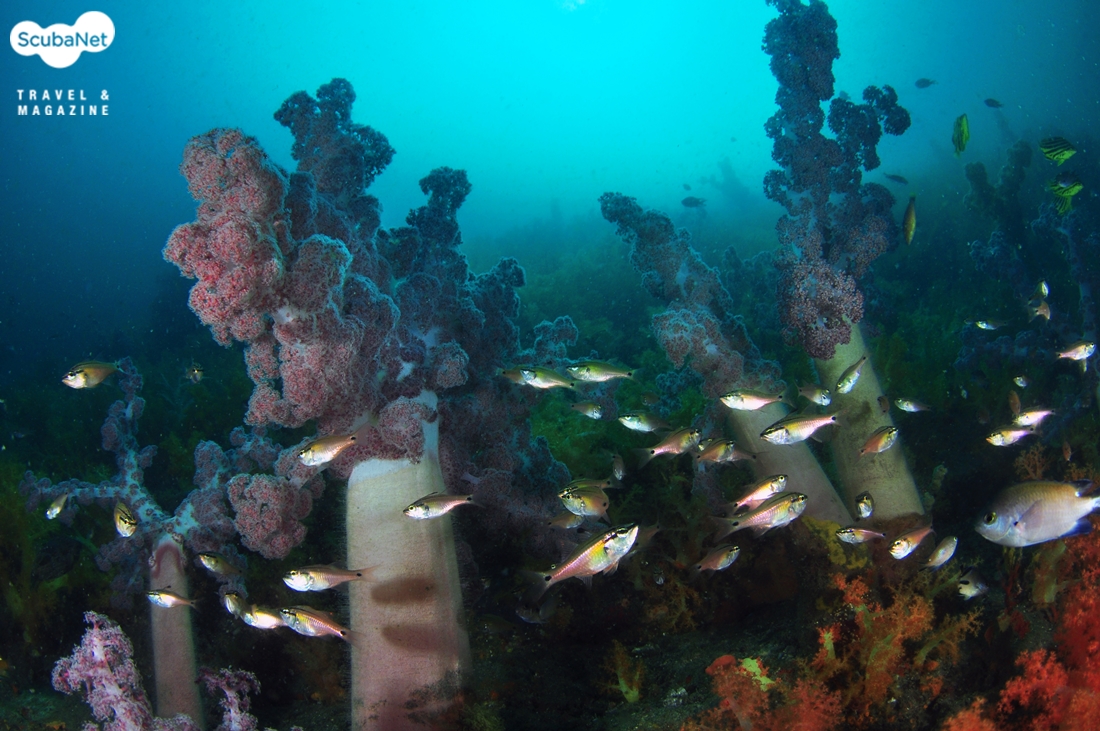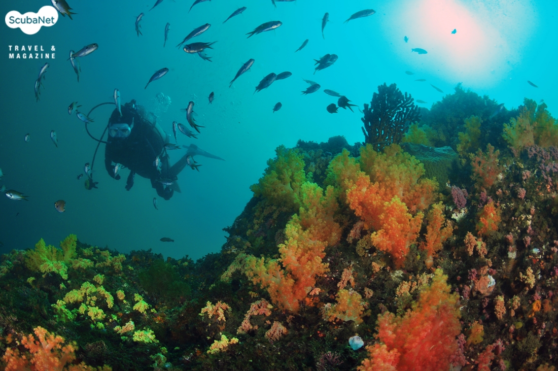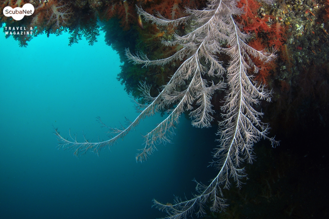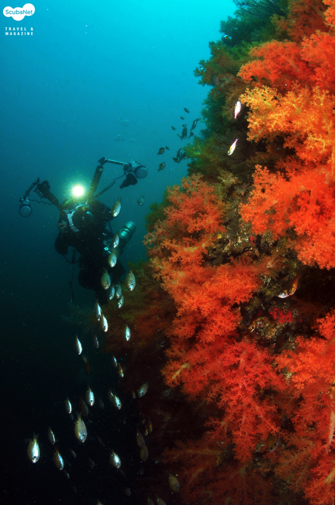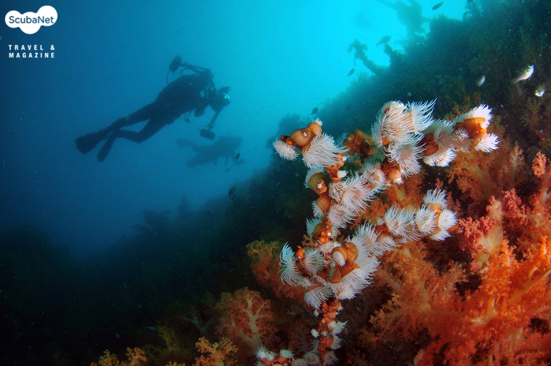 문섬 불턱 절벽에 자리잡은 담홍말미잘 군락과 얕은 수심으로 지나가는 다이버들
