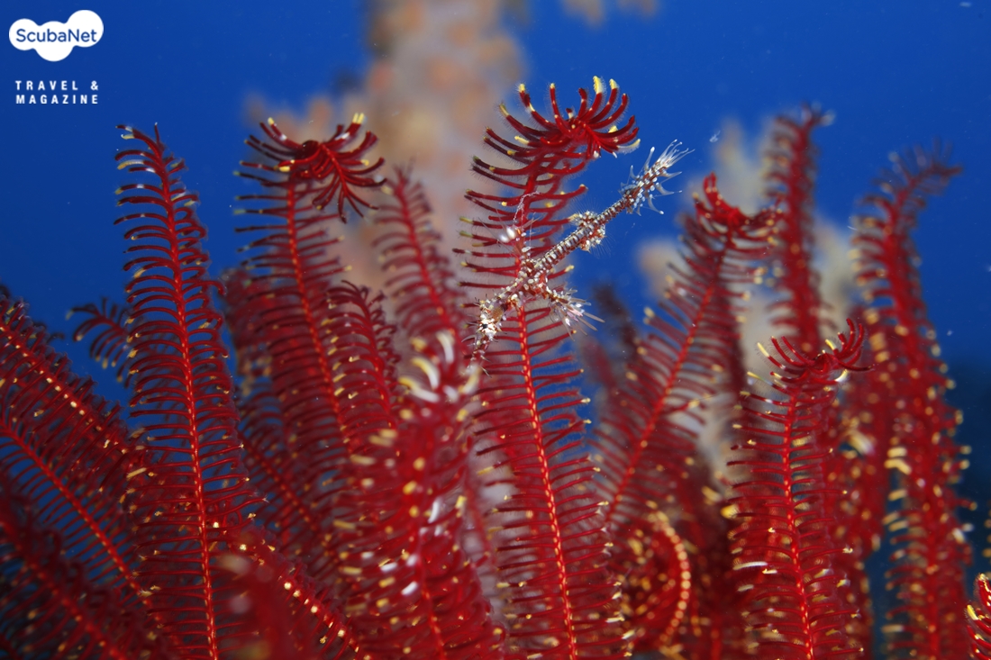 운 좋게 주간에 발견한 바다나리와 공생 새우. 공생새우가 정면 바깥쪽에 나와 있었다. 회초리산호와 바다나리의 어우러짐이 좋다.