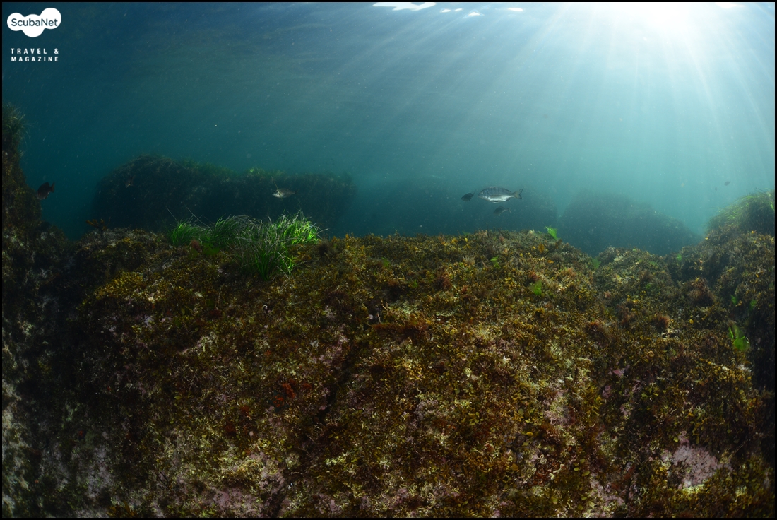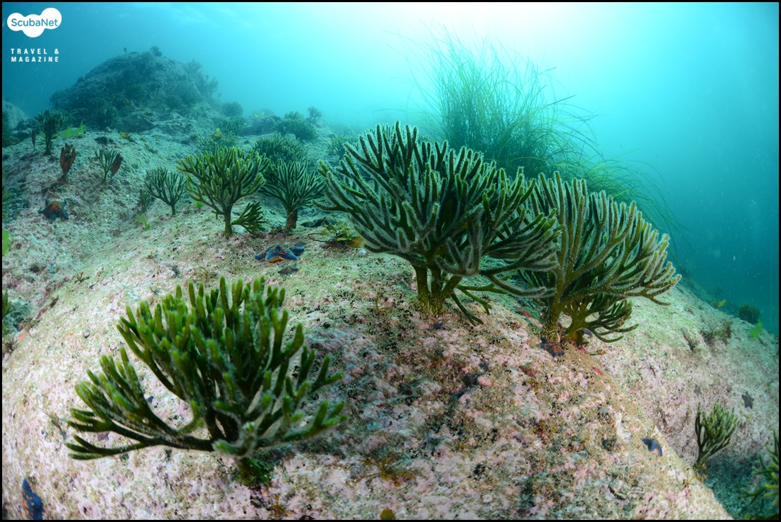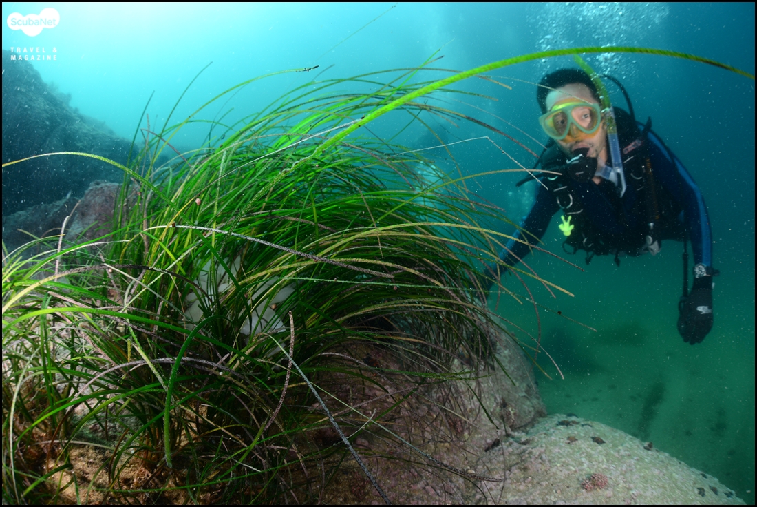 청각들과 잘피들이 숲을 이루는 비치의 암반