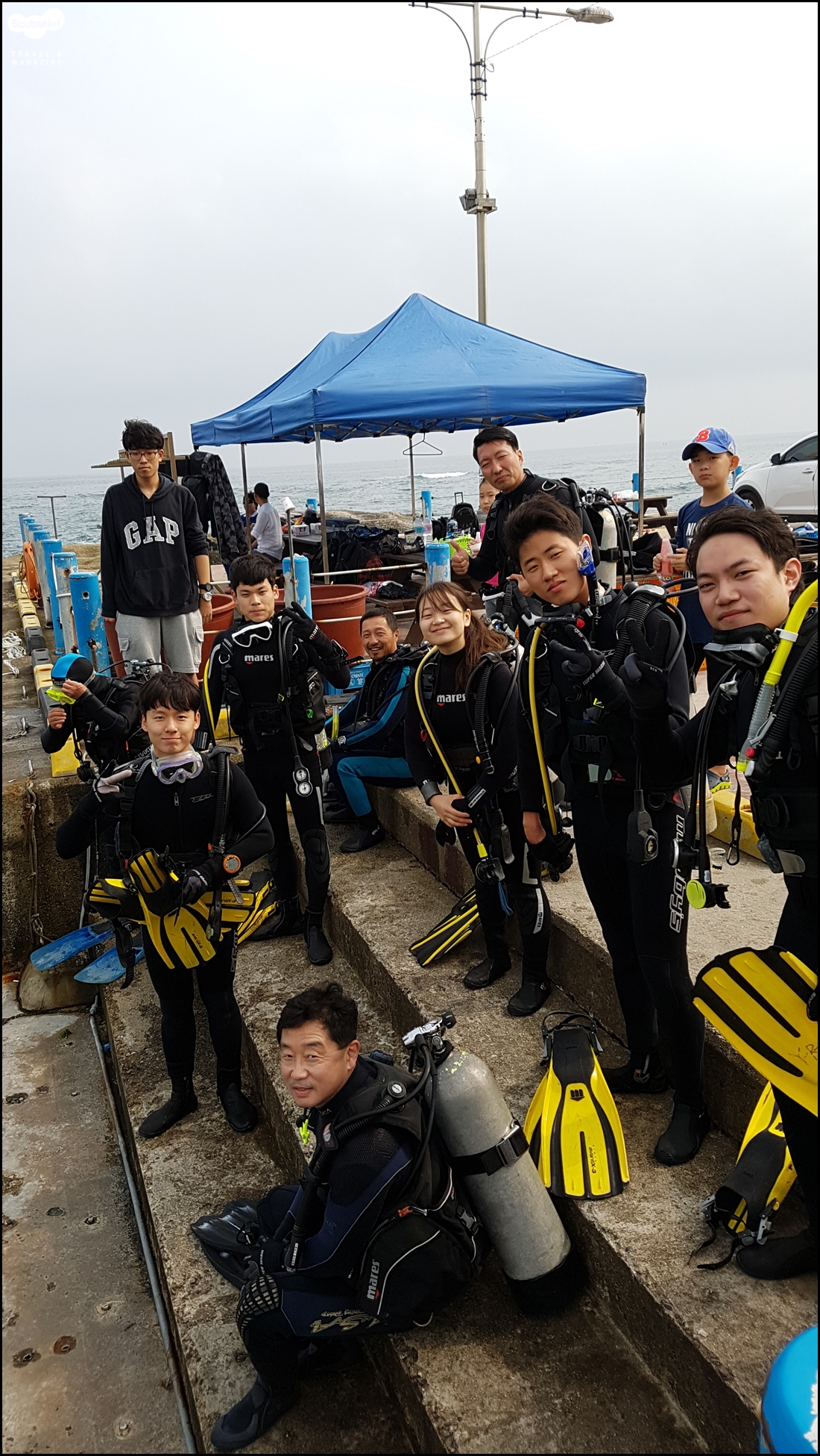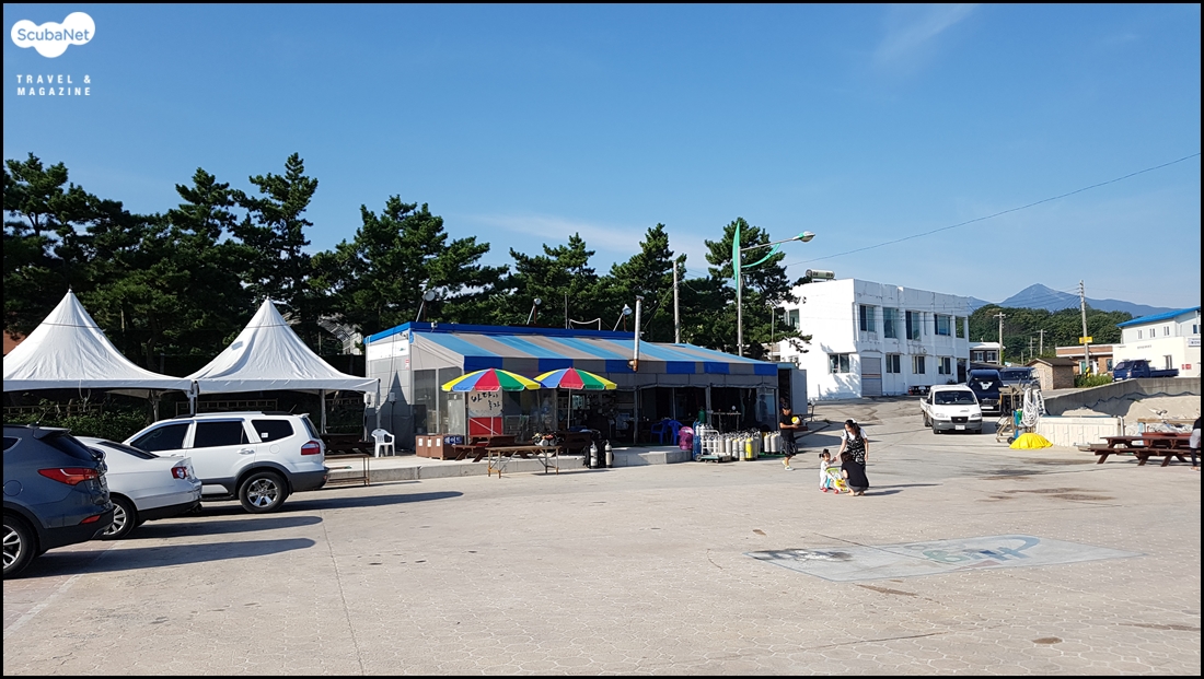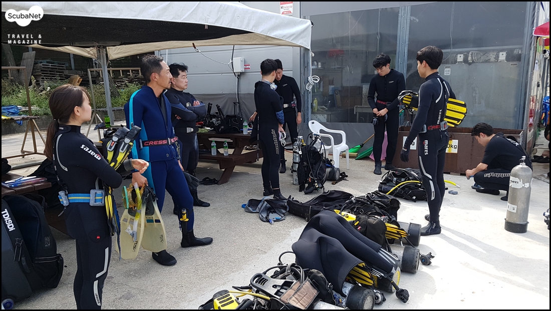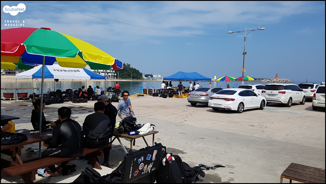 다이버들이 제각각 자리를 차지하고 있는 청간정 스쿠버