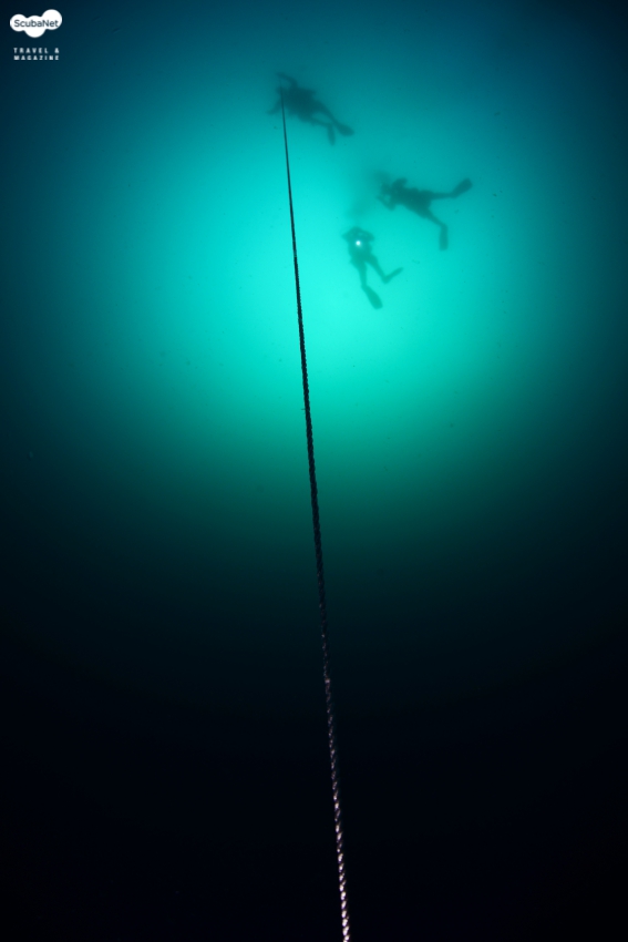 30m 길이의 탐사용 부의에 의지해 안전 정지를 하는 딥다이버들