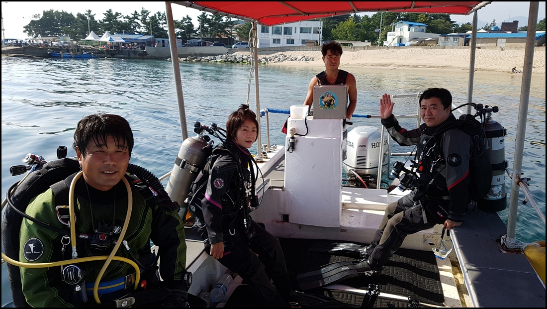 새로운 포인트를 기대하며 출발하는 딥다이버들GPS에 기록된 위치를 찾아 수면에서 내린 마크부이는 계획과 달리 바닥에 닫지 않고 떠다녔다. 수심 40m 이상의 깊은 곳이기에 어탐에 수심도 잘 찍히지 않았기에 더블탱크를 착용한 이성호 트레이너가 먼저 입수하여 봉우리를 찾으면 신호를 하기로 했다. 잠깐 기다리다가 마크부이가 물 속으로 가라앉았다가 다시 떠오르는 것을 신호로 입수하였다. 하지만 이성호 트레이너는 허공에서 안전정지를 하고 있었다. 못 찾은 것이었다. 결국 다시 출수하고 그 보다 전주에 찾아서 부이를 매달아 놓은 이름도 아직 정하지 못한 포인트로 다시 입수하였다.