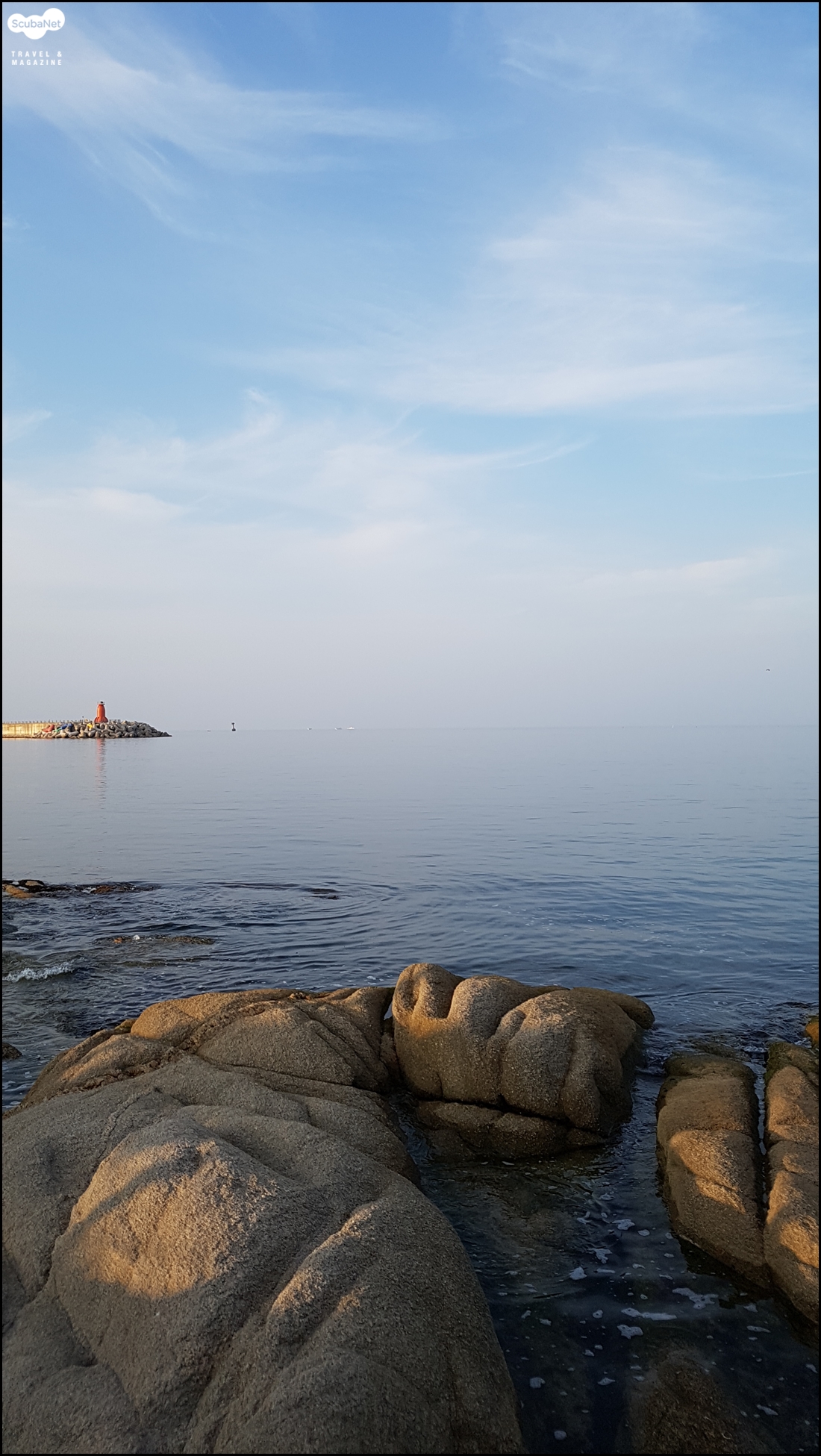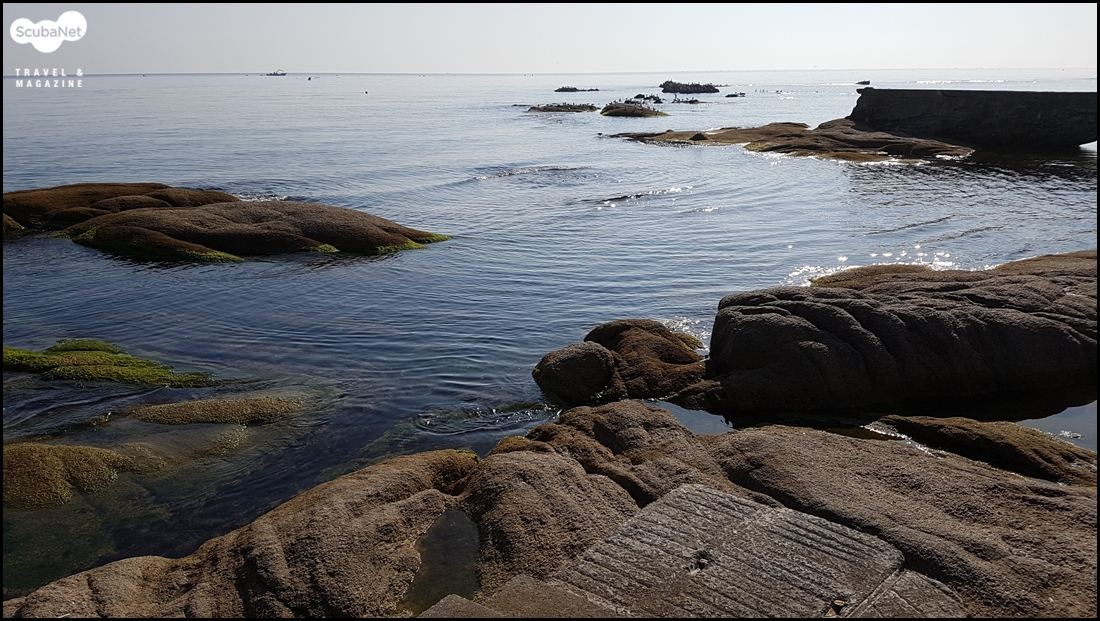 청간정의 암반 해변은 스쿠버 교육을 위한 비치 다이빙을 하기에 좋다.
