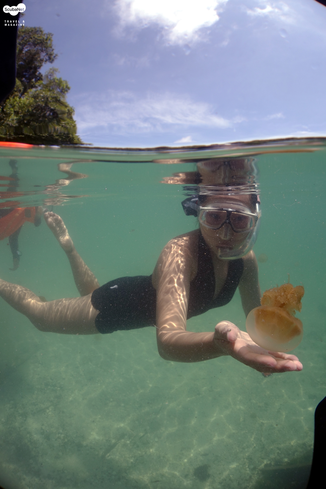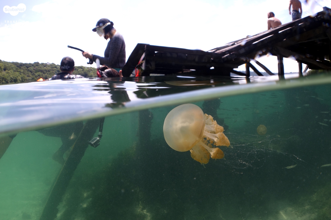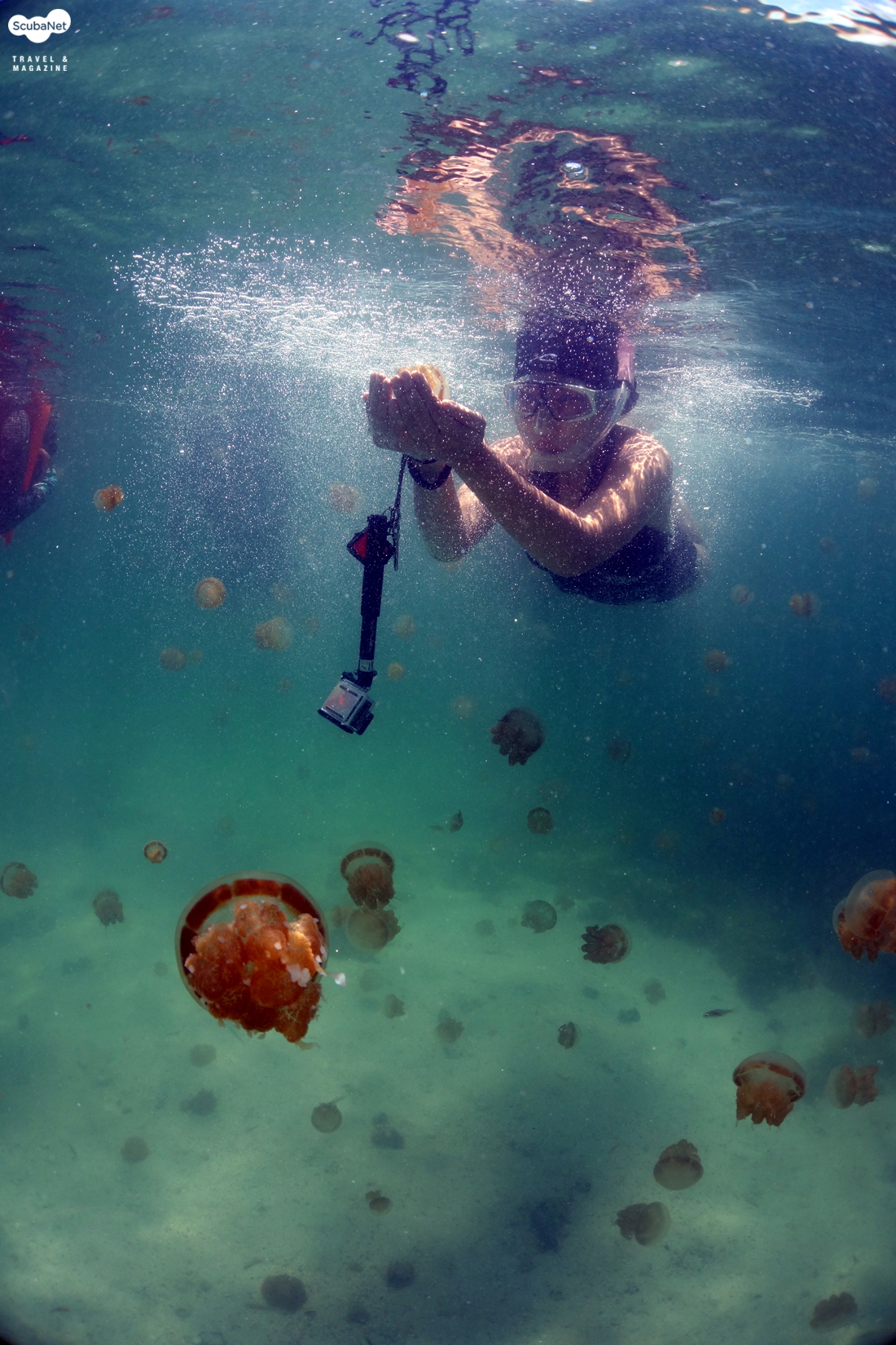 젤리피쉬 레이크에서 스노클하는 다이버들따라서 수영을 못하시는 사람들은 구명조끼나 튜브를 통해 체험할 수 있으며, 다이버들은 슈트를 입거나 수영복만 입고 해파리와 함께 유영할 수 있다. 지금은 팔라우에서 찾아볼 수 없는 쏘지 않는 해파리와의 유영은 기억에 남는 추억이었다.