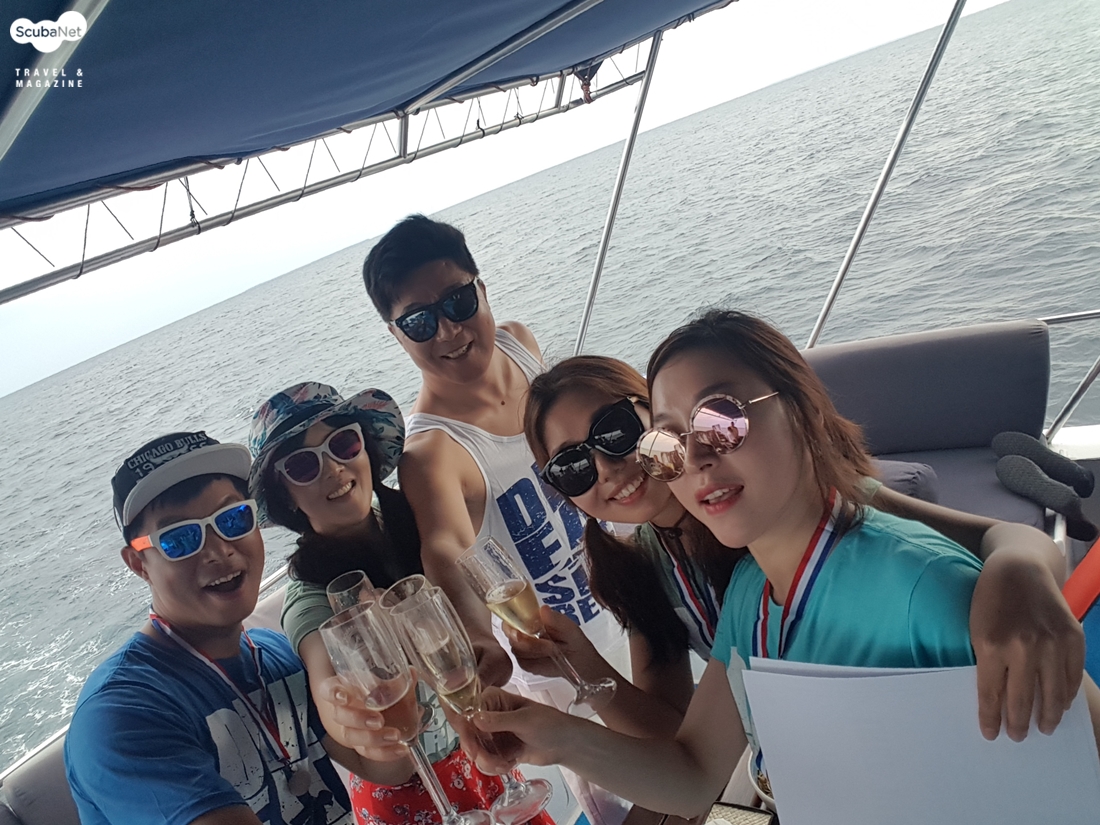 칵테일을 즐기는 한국의 정예 멤버저녁에는 어그레서에서 마련한 바비큐 파티가 있었다. 와인 잔을 들고 건배를 하며 다이빙의 아쉬움을 달래는데 아이언 다이버 메달 수여식이 진행되었다. 어그레서에서는 투어기간 동안 계획된 다이빙을 하나도 빠지지 않고 다 한 다이버들에게 이이언 다이버 Iron Diver 메달을 제공해주고 있다. 메달과 함께 인증서를 받으니 기분 좋게 투어를 마무리할 수 있었다.