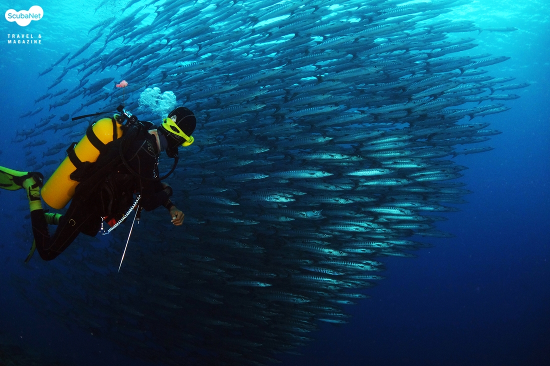 바라쿠다 무리와 구경하는 다이버일제히 조류걸이를 걸고 장관을 보던 중 다른 다이버들이 바라쿠다 무리를 쫓아 조금씩 이동하고 있었다. 하지만 덩치 큰 카메라 장비 덕분에 필자는 바위 뒤에 숨어서 잠시 쉴 수 밖에 없었다. 그때 멀리서 들려오는 다급한 쉐이크 소리에 수면 쪽으로 눈을 돌리니 다이버들이 쫓던 그 무리들이 내 앞으로 지나가는 것이었다. 그때부터 나의 스트로브는 쉴새 없이 터졌다. 바라쿠다 무리와 함께 했던 그 흥분은 한동안 내 가슴은 가시질 않았다.