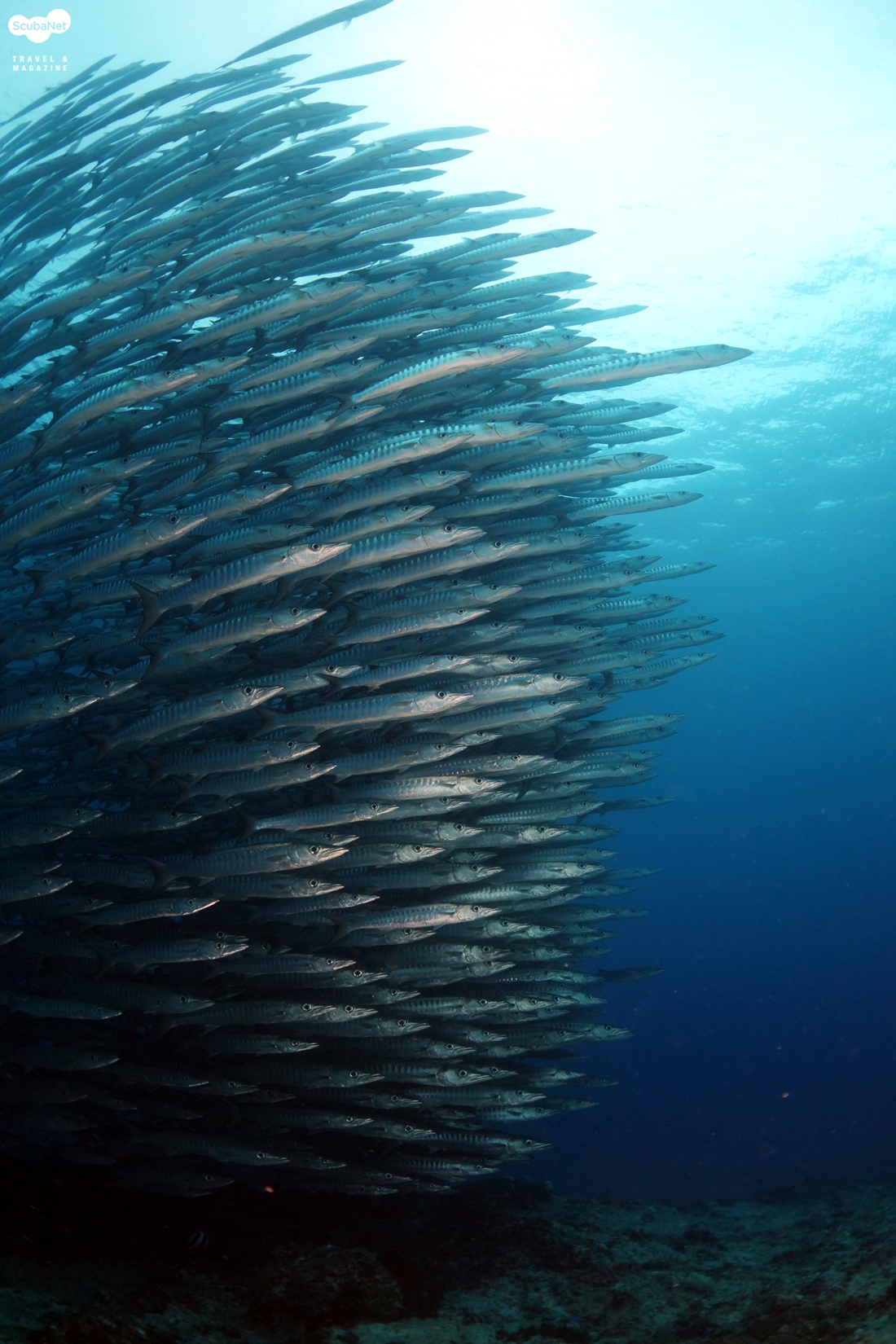 고래상어다이빙 다섯째 날 마라투아 아톨바라쿠다 떼로 유명한 마라투아 아톨 Maratua atoll에서 다이빙을 했다. 해당지역은 조류가 강력하며 운 좋으면 수천 마리의 바라쿠다를 볼 수 있다고 한다. 따라서 조류걸이를 지참하라고 입수 전 브리핑에서 다이버에게 이야기를 했다. 입수 후 얼마 지나지 않아 조류와 함께 수백 아니 수천 마리의 바라쿠다 무리를 만나게 되었다.