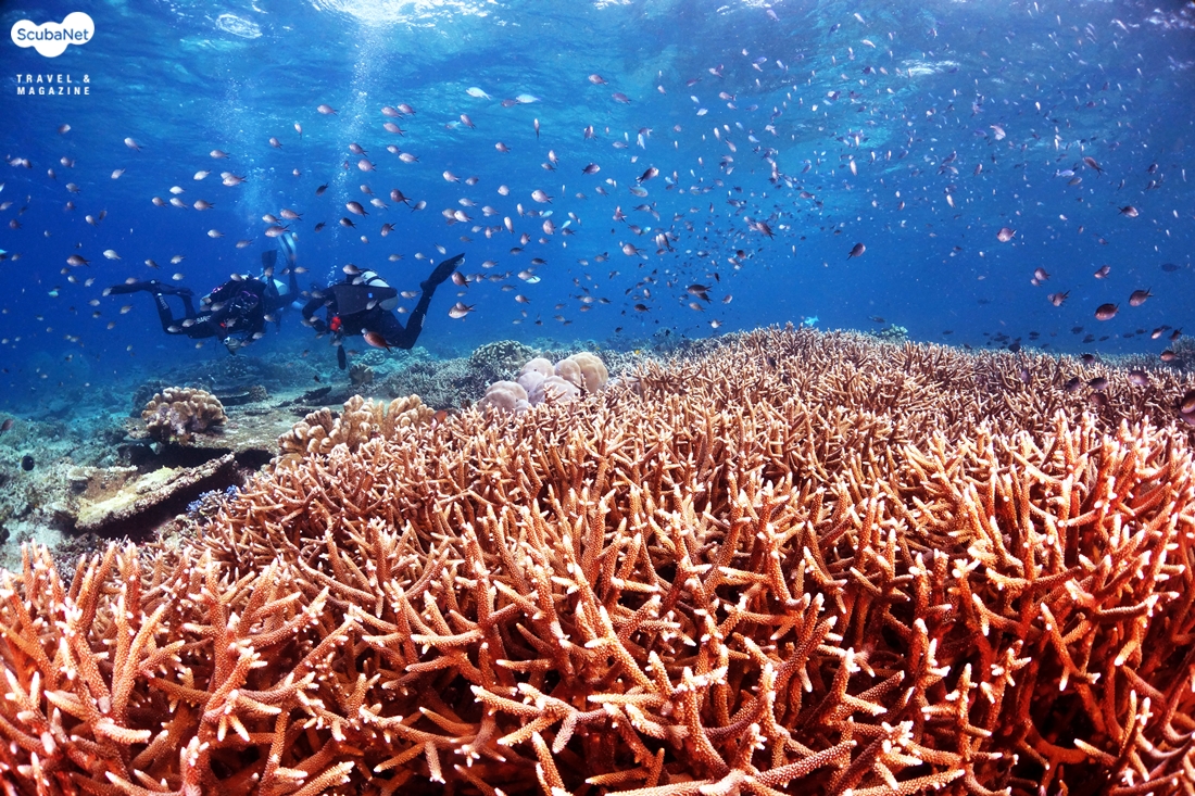 건강한 사슴뿔산호 군락에서 안전 정지를 하고 있는 다이버들
