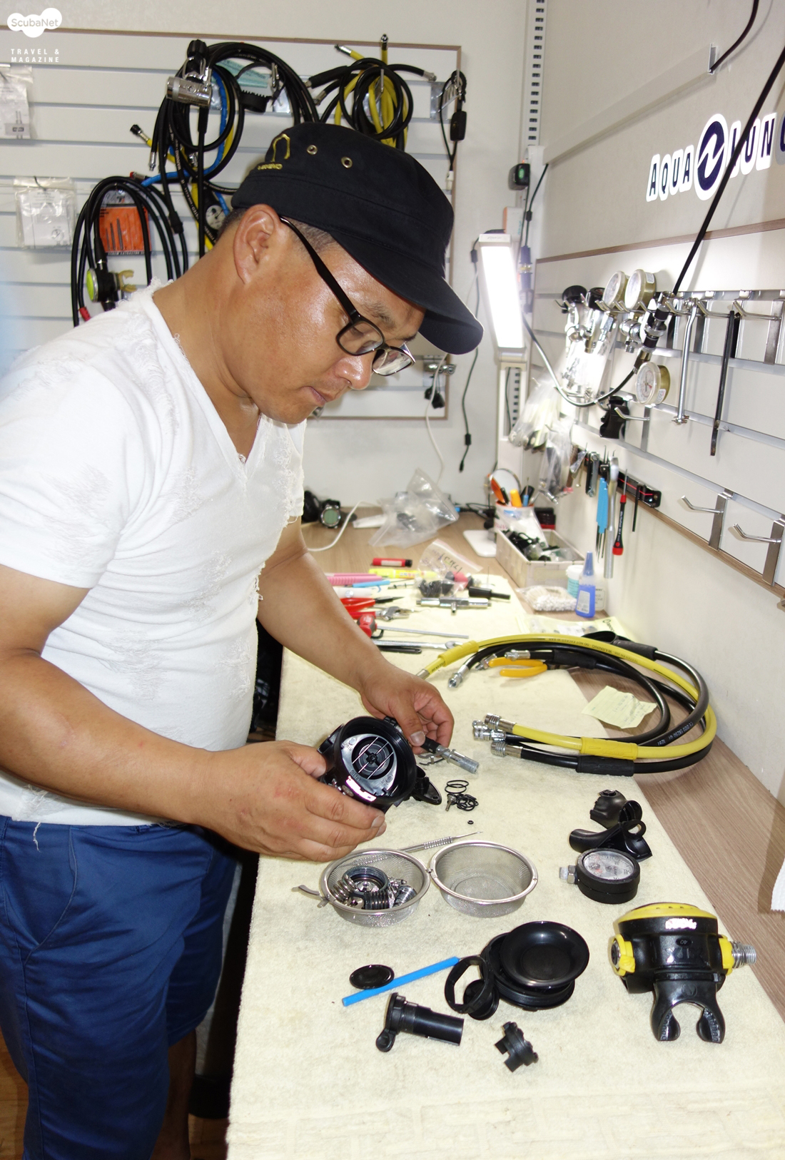오랫동안 다이빙을 하지 않았다면 장비는 꼭 점검해야 한다. 사진은 호흡기 수리 중인 아펙스 코리아의 심재호 대표