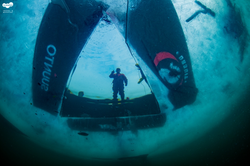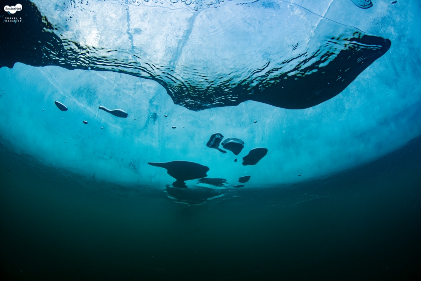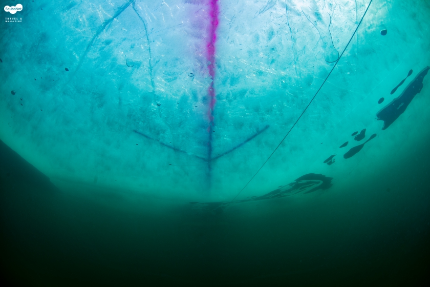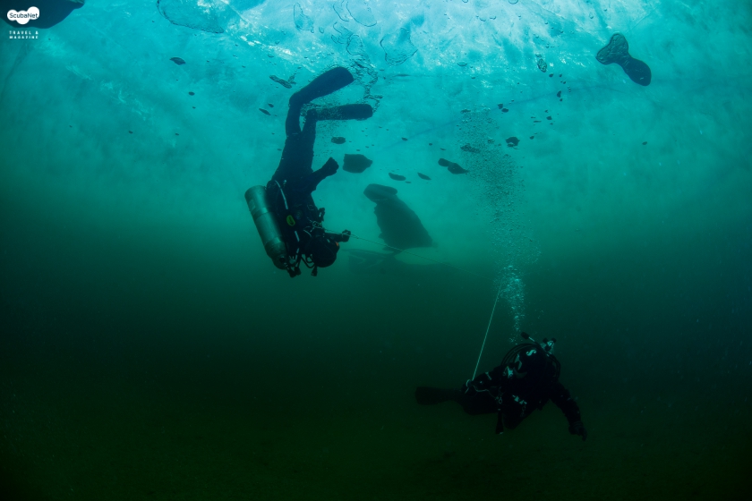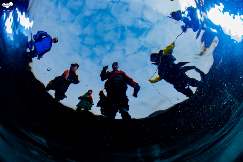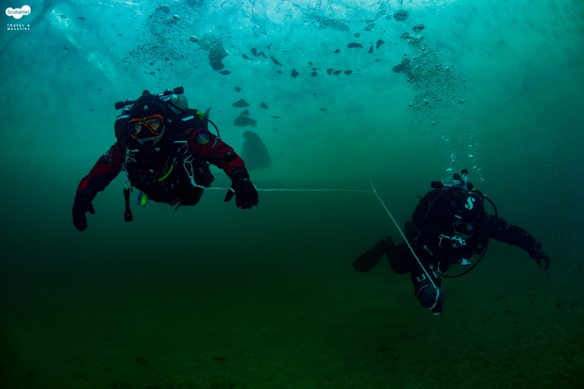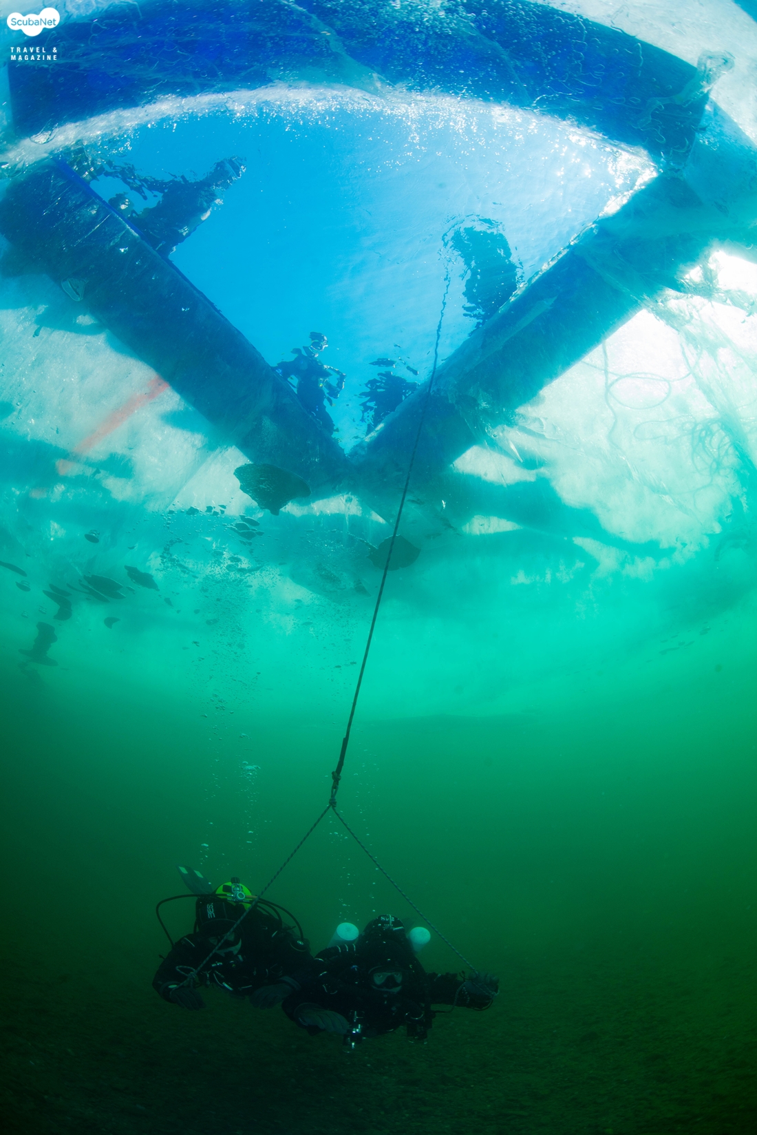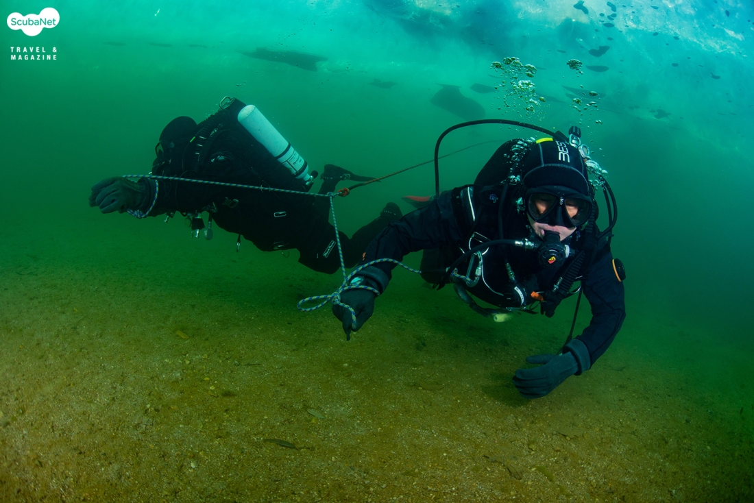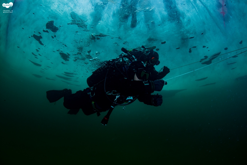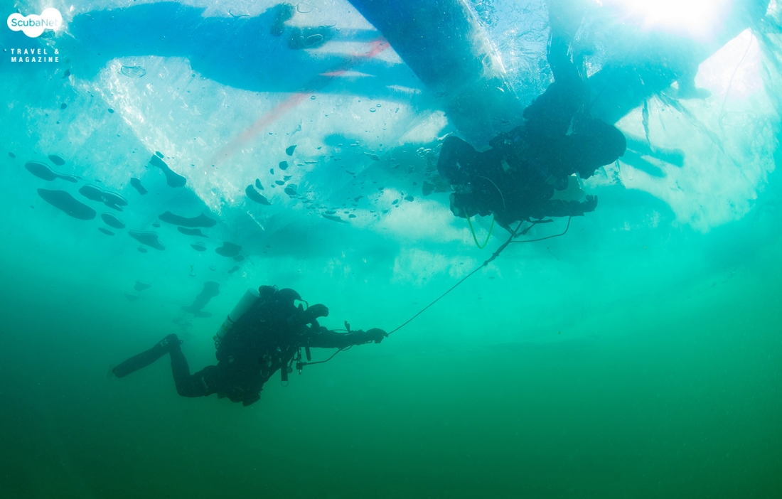 얼음 층 아래에 모여서 흘러가는 공기방울들하지만 이런 짧은 다이빙이지만 이를 위해서 준비하는 것은 만만치 않다. 얼음으로 위가 가로막힌 환경은 일반적인 오픈워터 다이버들이 접근할 수 없는 환경이다. 따라서 안전하게 다이빙을 하기 위해서는 특별한 교육과 훈련 그리고 장비와 준비가 필요하다. 2℃ 정도의 수온은 물론 영하의 기온에 대비할 수 있는 보온 대책과 호흡기의 결빙문제를 해결해야 하고, 수중에서 길을 잃지 않고 안전하게 출수하기 위해 얼음 구멍은 물론이고, 얼음 위의 표식과 안전줄까지 착용해야 한다.