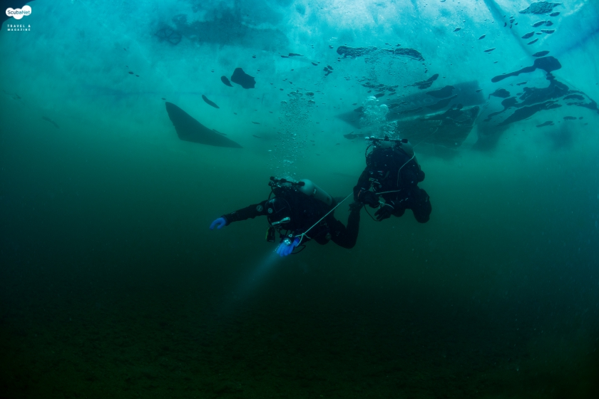 먼저 입수한 다이버가 버디를 기다리는 모습 사실 대부분의 아이스 다이빙은 바텀타임을 20분을 넘기지 않는다. 수심도 5m이내가 대부분이고, 볼거리라고 해봐야 겨울에 잠자는 민물고기나 빙어밖에 없으며 대부분 이 마저도 없어서 얼음 아래로 흘러가는 다이버들의 공기방울이나 얼음층 밖으로 보이는 얼음 위의 사람들을 구경하다가 나온다.