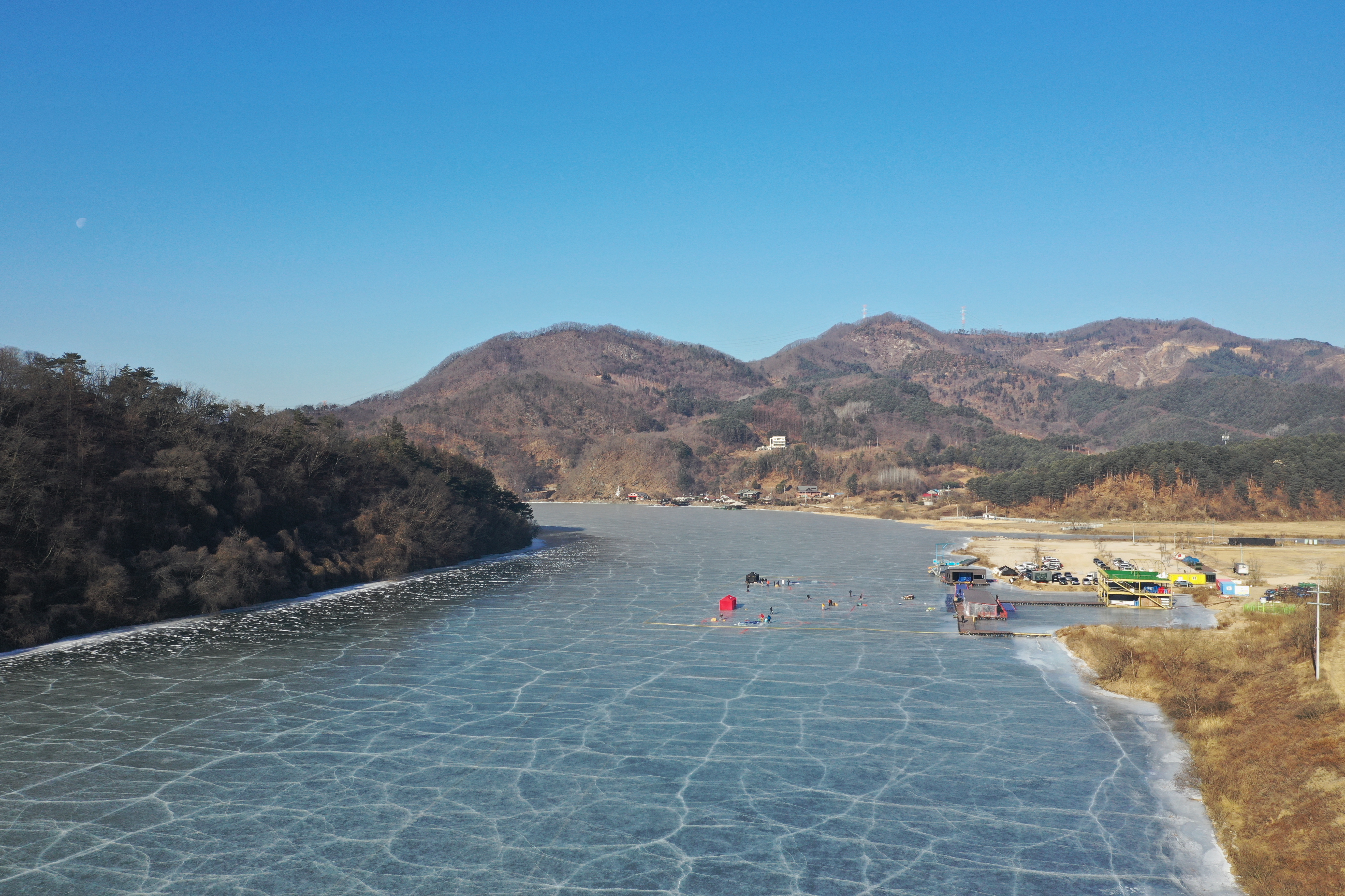 다이빙을 마친 다음에는 준비한 드론으로 항공촬영을 해보았다. 얼어붙은 북한강은 갈라져서 특이한 문양을 보여주었다. 삼각형의 구멍을 만들어 그 속으로 드나들며 아이스 다이빙을 하는 다이버들과 주변을 둘러싸고 그들을 도와주거나 구경하는 사람들의 모습도 독특한 풍경을 만들어주었다.