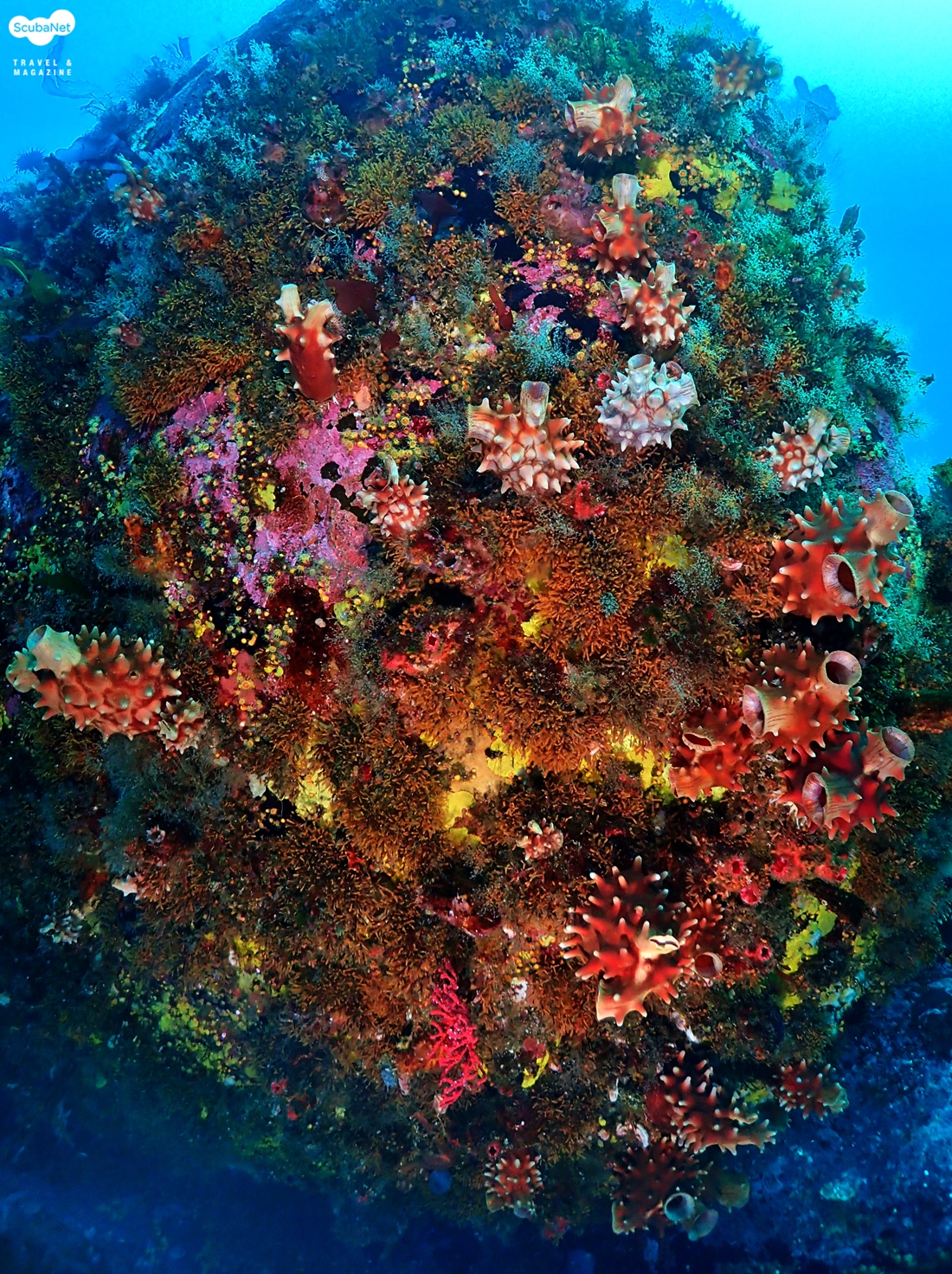 도담삼봉 포인트에서 암반에 서식하는 자연산 멍게들첫 다이빙은 '도담삼봉'으로 들어 가기로 했다. 수심 약 20m 정도인 도담삼봉 포인트는 큰 암반들이 군데군데 넓게 펼쳐져 있는데 입수 후 얼마 지나지 않아 깊은 수심의 바닥이 휑하니 보인다. 역시 시야가 좋다. 군데군데 해삼도 많이 보이고 제법 큰 우렁쉥이들도 많이 보인다. 커다란 암반을 요리조리 돌아다니면서 다이빙을 즐겼다. 첫 다이빙은 수온 11℃, 다이빙 시간은 37분이었다. 배 위에서 수면 휴식을 갖고 2번째 다이빙은 개인적으로 좋아하는 'K2'로 가기로 했다. 봉포의 배는 크기가 커서 배에서 수면 휴식을 갖기에 큰 불편함이 없었다.