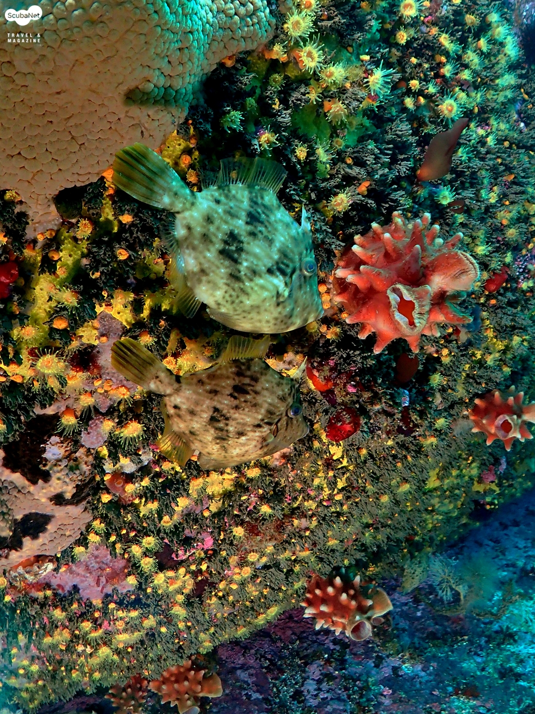 도담삼봉 포인트에서 만난 쥐치 한쌍K2 포인트에 도착해서 하강라인을 따라 내려가니 낯익은 암반과 산호의 모습들이 눈에 들어왔다. 그리고 아직 포란 중에 있는 쥐노래미는 우리의 갑작스런 방문에 당황했는지 행여 자기 알을 건드릴 까봐 신경이 잔뜩 곤두서 있다. 암반 사이로 빨간 부채뿔산호가 가득한 K2포인트는 봉포에서 손꼽히는 포인트가 아닐까 한다. 계절에 맞춰 가끔은 어마어마한 볼락 떼가 보이기도 하고 찬바람이 부는 계절에는 여기저기서 알을 품고 있는 노란색의 쥐노래미들이 보이곤 한다. 산호에는 평소에 보기 힘든 개오지들이 유난히 많이 붙어 있었고, 산란 중인 갯민숭달팽이도 많이 보였다. 한참을 사진 찍다 보니 박용진 씨가 손목을 가르친다. 속으로 "아이고" 소리를 외치며 사진에만 정신이 팔리다 보니 어느새 시간이 이렇게 되었는지 몰랐다.