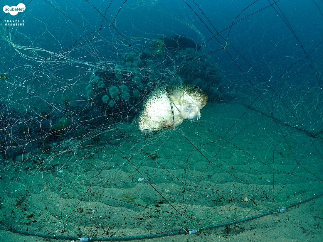 문어의 모습을 동영상으로 촬영 중인 박주극강사더 진행을 하다 보니 이번에는 어민들이 쳐 놓은 그물에 도치가 걸려 있다. 숨도 못 쉬고 아등바등 걸려서 죽은 모습이 그물에 걸린 지 어느 정도 시간이 지난 것 같다. 군데, 군데 안타까운 죽음을 맞이한 도치들이 걸려 있다. 다이빙을 하는 다이버의 입장에서 고귀한 생명이 죽어가는 모습을 보고 있으니 마음이 착잡했다. 하지만 어민들은 나름대로 생계를 유지해야 하는 일이기 때문에 죽어가는 생명을 보면서 내가 할 수 있는 일은 없었다. 단지 그물도 다이버들에게 공포의 대상이기 때문에 뒤로 물러서는 방법 밖에 없었다.