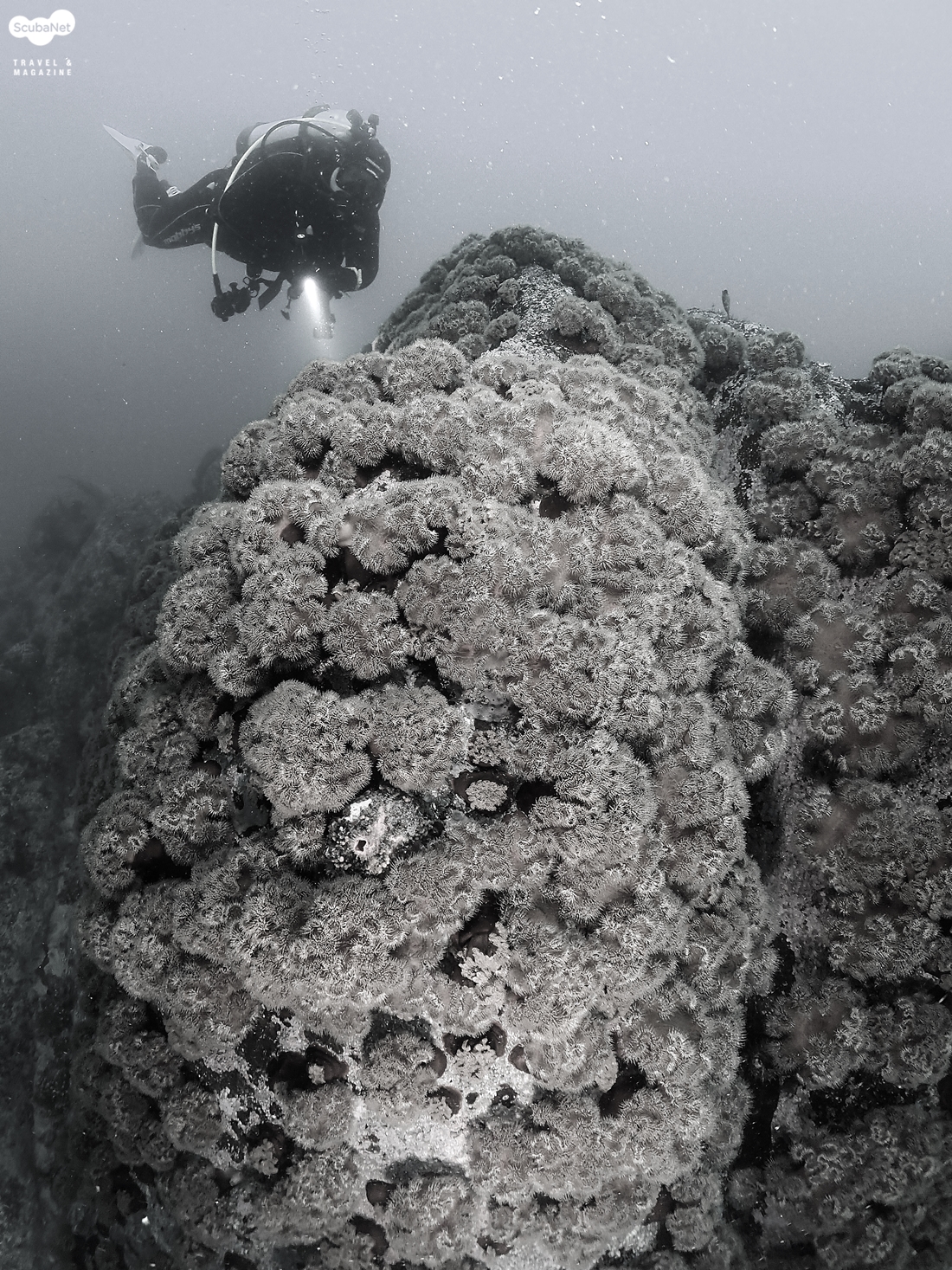 말미잘 봉우리를 흑백으로 표현하였다지난 주에는 추워도 시야가 워낙 좋아서 2번의 다이빙을 하였는데 이번 다이빙은 추위와 그리 좋지 않은 시야가 두 번의 다이빙을 거부한다. 수온이 차가울 수록 말미잘의 화려한 모습은 더 멋있어 지는데 그런 멋스러움은 모두의 마음에 간직하고 다음 다이빙을 기약해야만 했다. 그렇게 말미잘을 눈으로 담으러 떠난 다이빙 여행은 '백상어 다이브 리조트'에서 또 하나의 아쉬운 추억만을 만들고 되돌아왔다. 몇 일이 지나면 머릿속에는 말미잘의 모습이 새삼스럽게 다시 떠 오를 것 같다. 그러면 또 다이빙 장비를 챙겨서 강원도 고성의 어느 바닷가를 찾아 갈 것이다. 그것이 설렘과 아쉬움이 교차하는 단 한번의 다이빙이라 할지라도 말이다 . . .