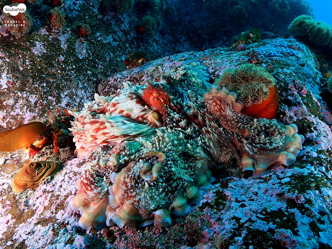 말미잘 포인트에서 만난 문어암반 사이를 돌아 가니 문어 한 마리가 자리를 잡고 있다. 같이 간 일행한테 쳐다보라고 손짓하며, 수중렌턴으로 비추어 주었지만 암반과 비슷하게 한껏 위장한 문어를 쉽게 발견하지 못하고 그냥 지난 친다. 그런 일행의 오리발을 잡아서 다시 보라고 가르쳐 주니 그제서야 문어를 알아보고 OK 사인을 준다. 문어 사진을 몇 장 찍고 다시 다른 곳으로 이동을 해 본다. 바닥의 모래 위에 로프가 깔려 있어 로프를 따라 가본다. 한참을 가니 작은 암반에 또 다른 말미잘들이 모습을 나타내고 있다. 바닥의 모래 때문인지 전날의 파도 때문인지 사진을 찍어도 부유물이 너무나 많이 같이 찍힌다.