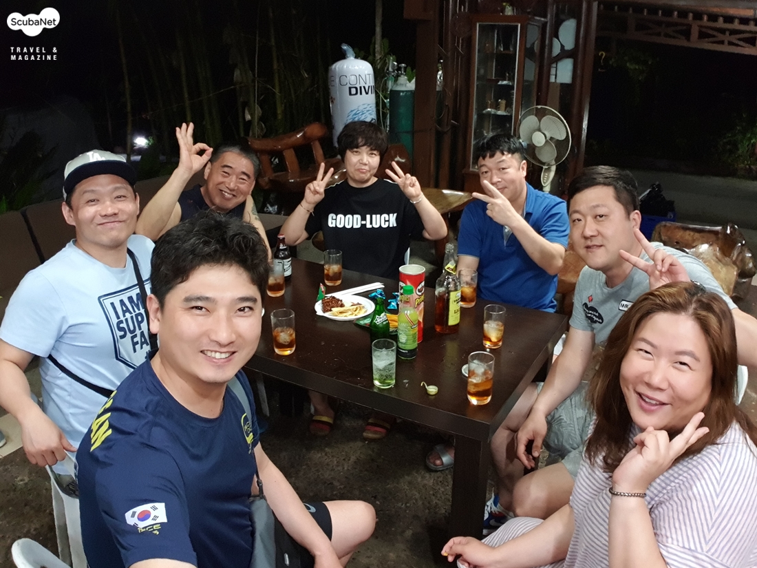 다이빙 첫날은 마침 Go2dive 대표님의 생일이라 사모님께서 투숙하는 다이버 전원을 삼겹살 생일파티에 초대해 주셨다. 우리는 팡글라오 시내의 ‘Bohol Pearl 레스토랑’으로 이동하여 대표님 생일파티와 저녁식사를 대접받고, 근처의 마사지숍에서 피로를 푼 뒤 숙소로 복귀하였다. 리조트에서 이어지는 호프타임에는 남녀노소 할 것 없이 다이빙이라는 공통분모로 허물없이 친분을 쌓을 수 있는 시간이라 기분이 좋았다.