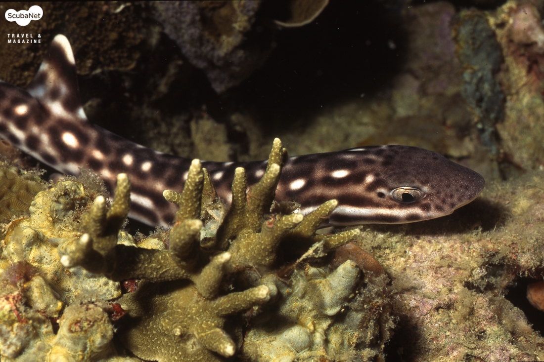 코랄캣상어 Coral catshark, Atelomycterus marmoratus두툽상어과 Scyliorhinidae에 속하는 길이 70cm까지 자라는 작은 상어이다. 파키스탄에서 뉴기니까지 인도태평양 지역의 얕은 산호초에서 흔하게 관찰된다. 몸통이 매우 가늘며 머리와 꼬리가 짧고, 두개의 등지느러미가 뒤쪽으로 기울어져 있다. 몸통과 지느러미에 검고 흰 점이 무수히 많은데 종종 점들이 서로 연결되어 수평의 줄들을 형성하기도 한다. 낮에는 조용히 은신해 있다가 밤이 되면 활발하게 먹이 활동을 한다. 필자가 찍은 사진도 말레이시아 랑카얀에서 선셋 다이빙을 했을 때 촬영한 것이다. 난생으로 암컷은 한번에 2개씩 지갑을 닮은 알집을 낳는다.
