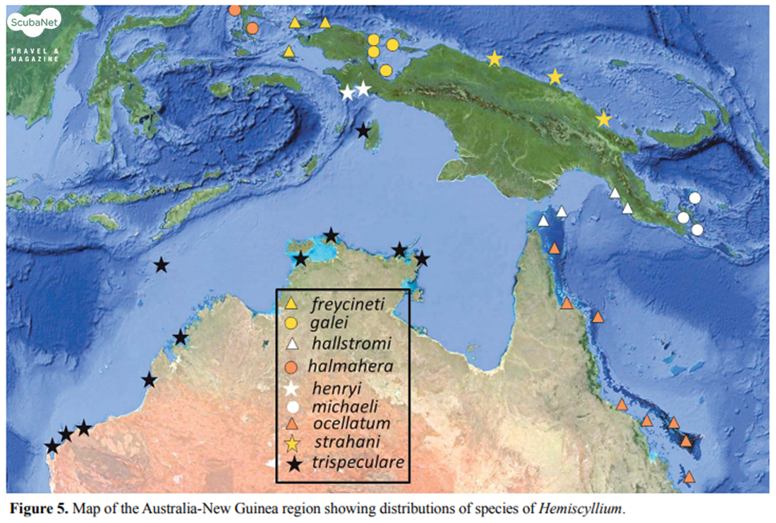 필자는 파푸아뉴기니 PNG의 투피 Tufi에서 야간 다이빙에서 Hemiscyllium michaeli을 촬영하였다. 이 종은 PNG의 밀른 베이 Milne Bay 근처에서만 발견되는 종으로 레오파드 에폴렛 상어 leopard epaulette shark 또는 밀른 에폴렛 상어 Milne epaulette shark라고도 한다. 또한 라자암팟에서 야간 다이빙 중에 Hemiscyllium freycineti를 촬영하였다. 이 종 역시 분포가 라자암팟으로 제한되며 영명으로 Indonesian speckled carpetshark이라고 한다. 이 둘은 같은 종으로 알고 있었지만 2010년 Gerald R. Allen and Cristine L. Dudgeon에 의해 다른 종이라는 것이 밝혀졌다.