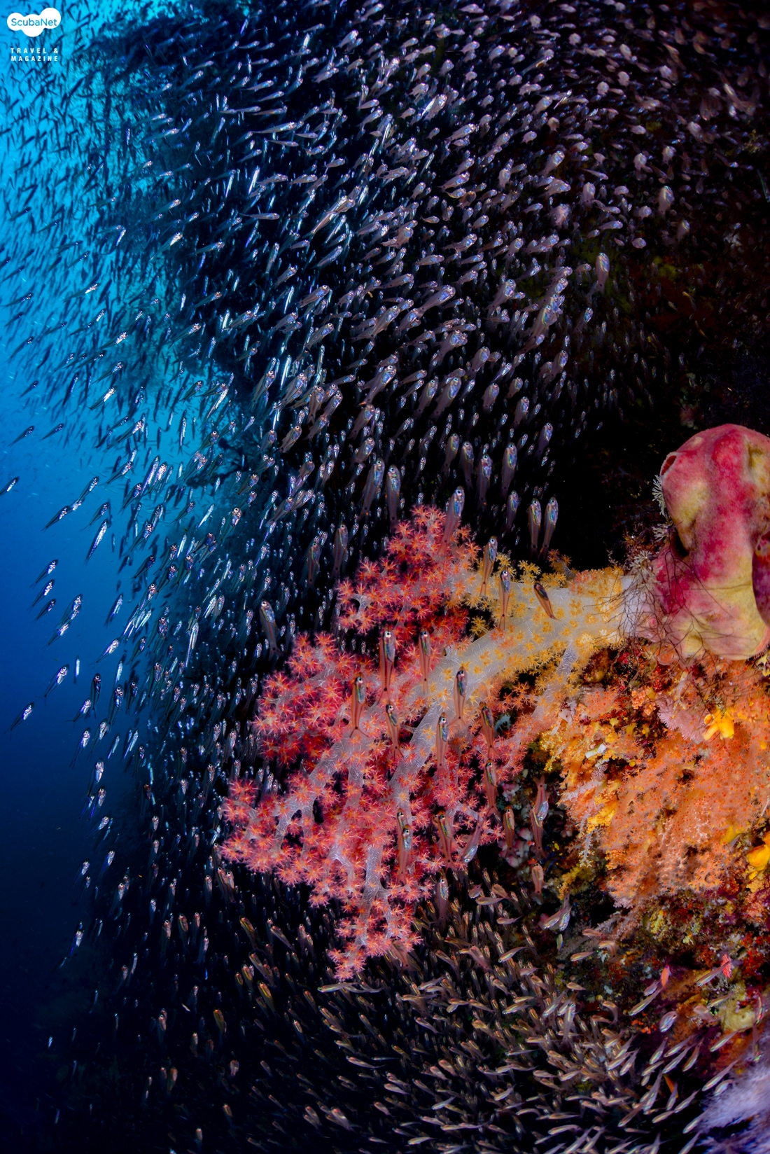 화려한 연산호를 뒤덮고 있는 카디널피쉬 무리