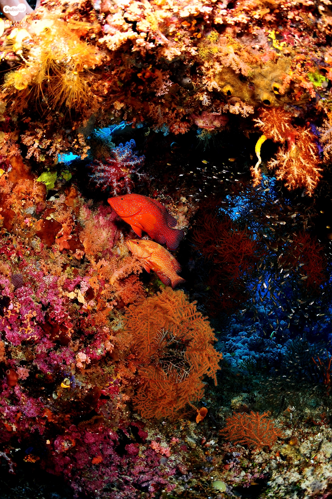 화려한 산호와 코랄 그루퍼 한 쌍