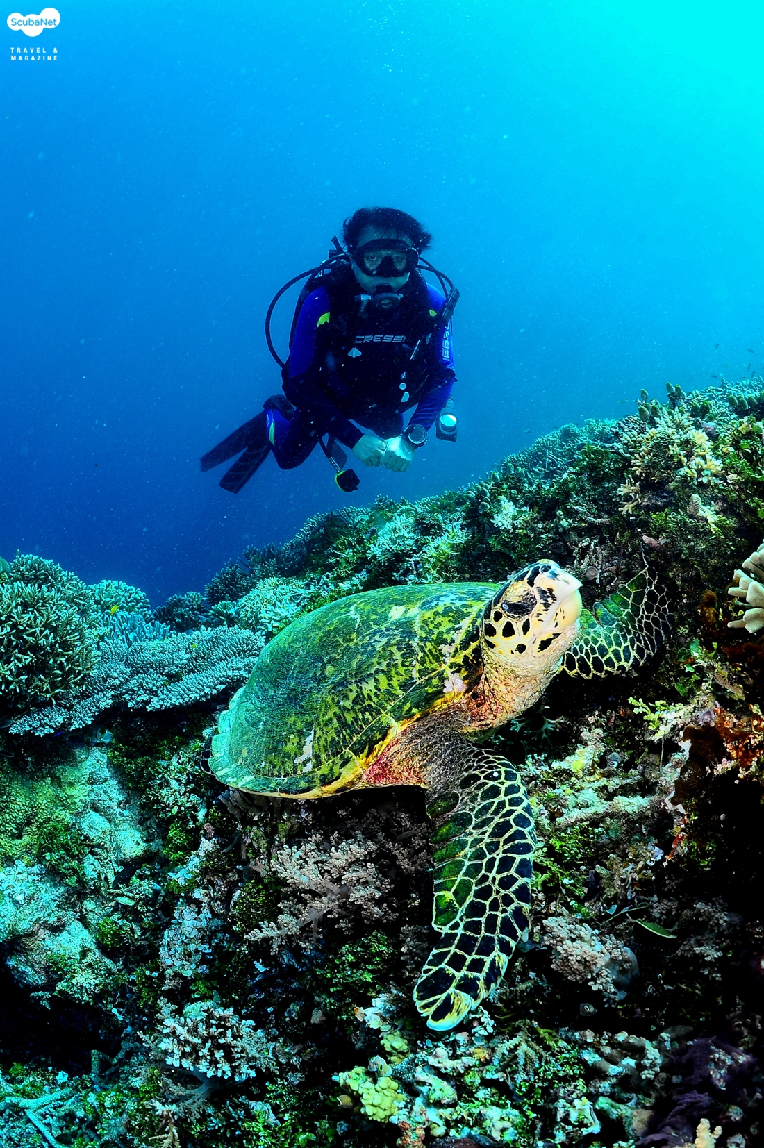 라자암팟의 건강한 산호지대에서 살고 있는 혹스빌터틀과 다이버