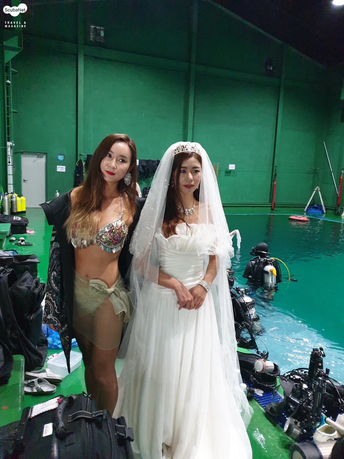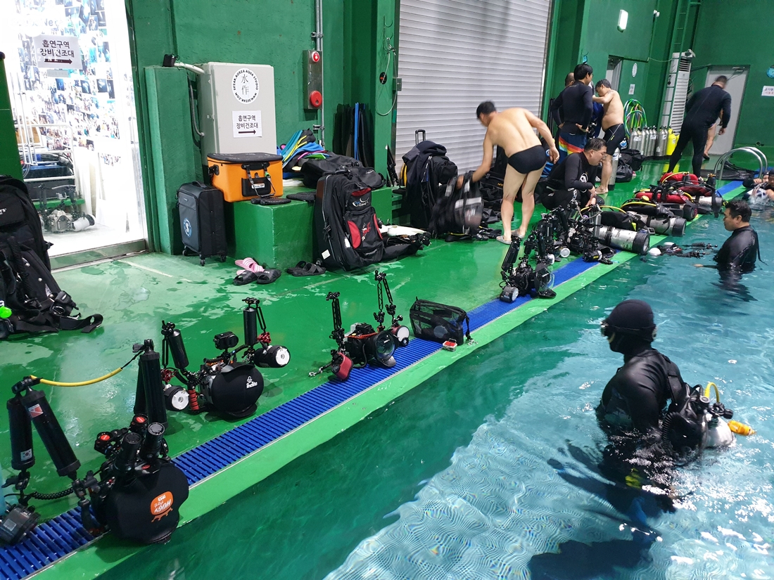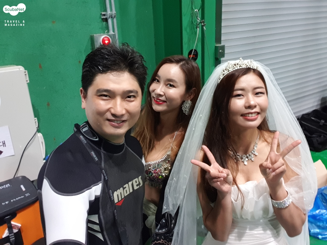 머슬마니아 배도의 씨와 웨딩드레스 차림의 고송미 씨브리핑 후 개인별 촬영장비 준비를 하며 대기하다가 수작코리아의 일반 다이버들이 퇴실한 오후 5시부터 촬영이 시작되었다.이번 모임이 두번째 참가여서 첫번째보다는 많이 여유롭게 준비를 할 수 있었다.