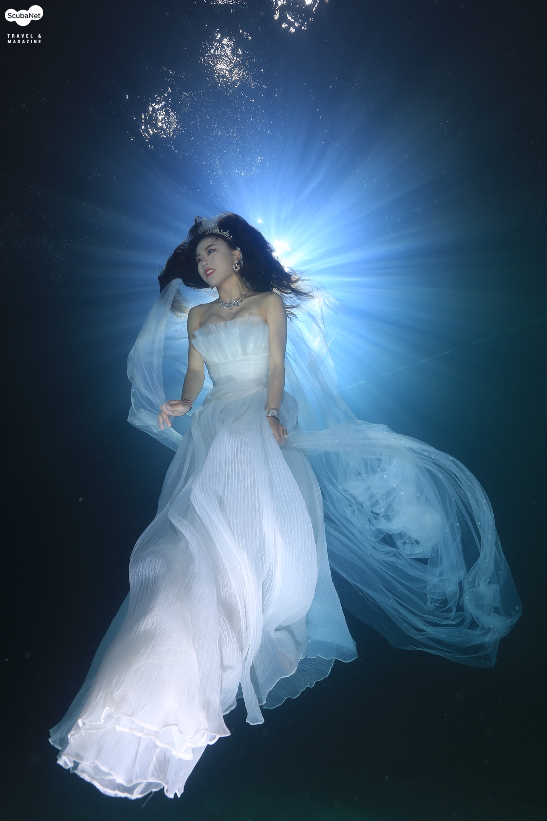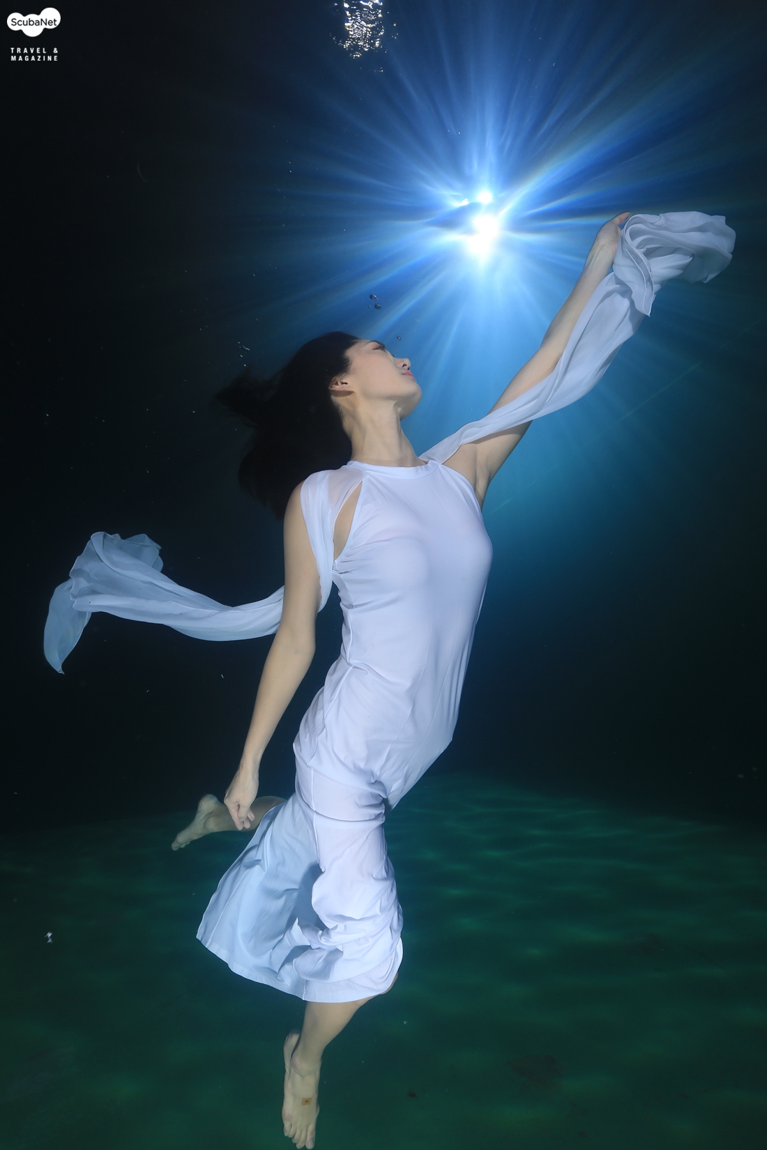 원피스 모델 박미경 씨 첫 번째 주제는 박미경 모델의 흰색 원피스였다. 수면에서 내려오는 모습과 수중에서의 포즈, 그리고 수면 위로 올라가는 모습 등짧았지만 부드럽게 표현을 해주었다.
