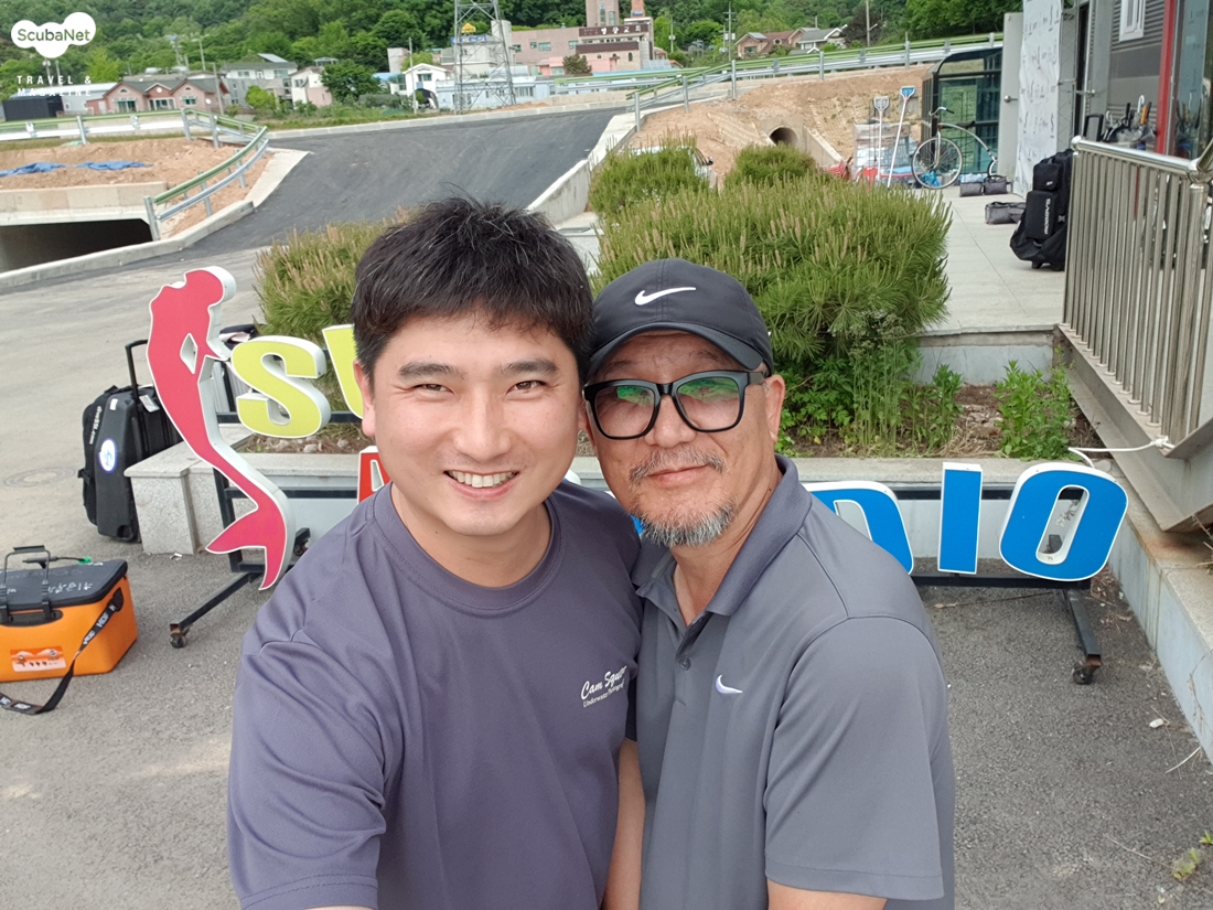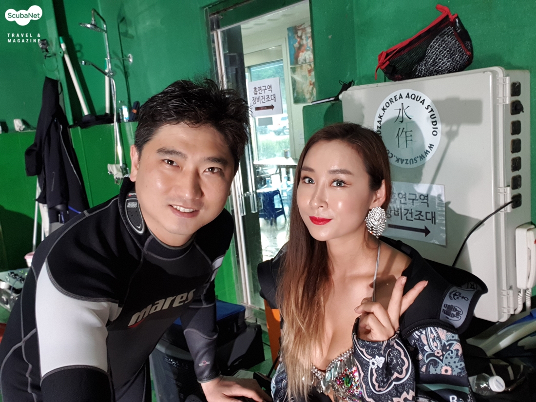 모델 배도의 씨와 필자 촬영회 일정이 회사동호회 정기투어와 날짜가 겹쳤지만 어느 하나 포기할 수 없는 상황이라서 오전 일찍 양양 남애스쿠버에서 2회 다이빙을 마치고 바로 일산의 수작코리아로 향했다.오후 3시부터 브리핑을 시작하였는데 브리핑 시간에는 참석자 자기소개, 사진의 주제설명과 그룹 나누기 그리고 그룹별 촬영순서를 정하였다.