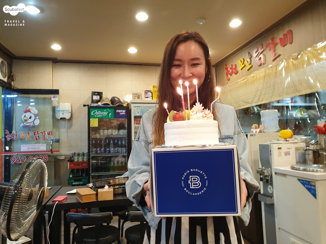생일 축하 케익을 받고 기뻐하는 배도의 씨