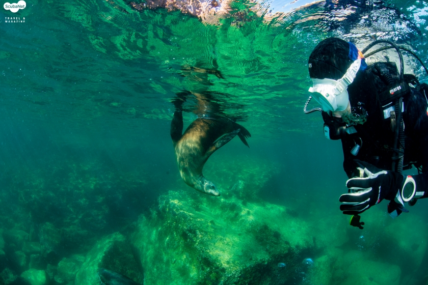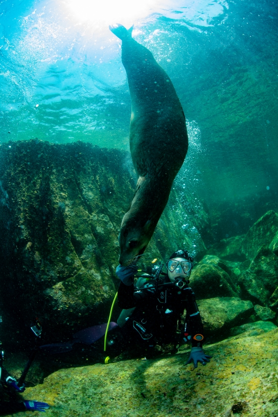 수면에서 쉬고 있는 바다사자와 다이버바다사자와의 교감은 라파즈를 찾는 다이버들이 가장 좋아하는 경험 중의 하나였다. 수중으로 내려와 오리발을 물고, 머리를 건드리고, 손을 내밀면 다가오는 녀석들의 초롱초롱한 눈망울을 보고 있으면 세상을 다 가진 듯하다. 바다사자와 직접 접촉하는 느낌은 잊을 수 없는 기억이 되는 것이다. 다이버들 중에 일부는 순전히 바다사자를 보기 위해 이번 투어에 참가했다고 한다. 이틀 동안 4회의 다이빙을 이들과 함께하며 충분한 교감의 시간들을 가질 수 있었다.