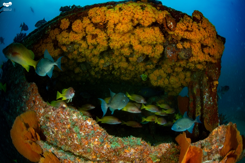 난파선에 부착된 산호와 내부의 물고기들난파선 포인트에서 먼저 다이빙을 했는데 난파선 잔해 근처에 모여 있는 엄청난 수의 엘로우 스내퍼 무리들과 노랑촉수들이 대단했다. 또한 엄청난 크기의 방어들도 보았으며, 황소상어도 가까운 거리에서 몇 번을 마주쳐서 촬영할 수 있었다.