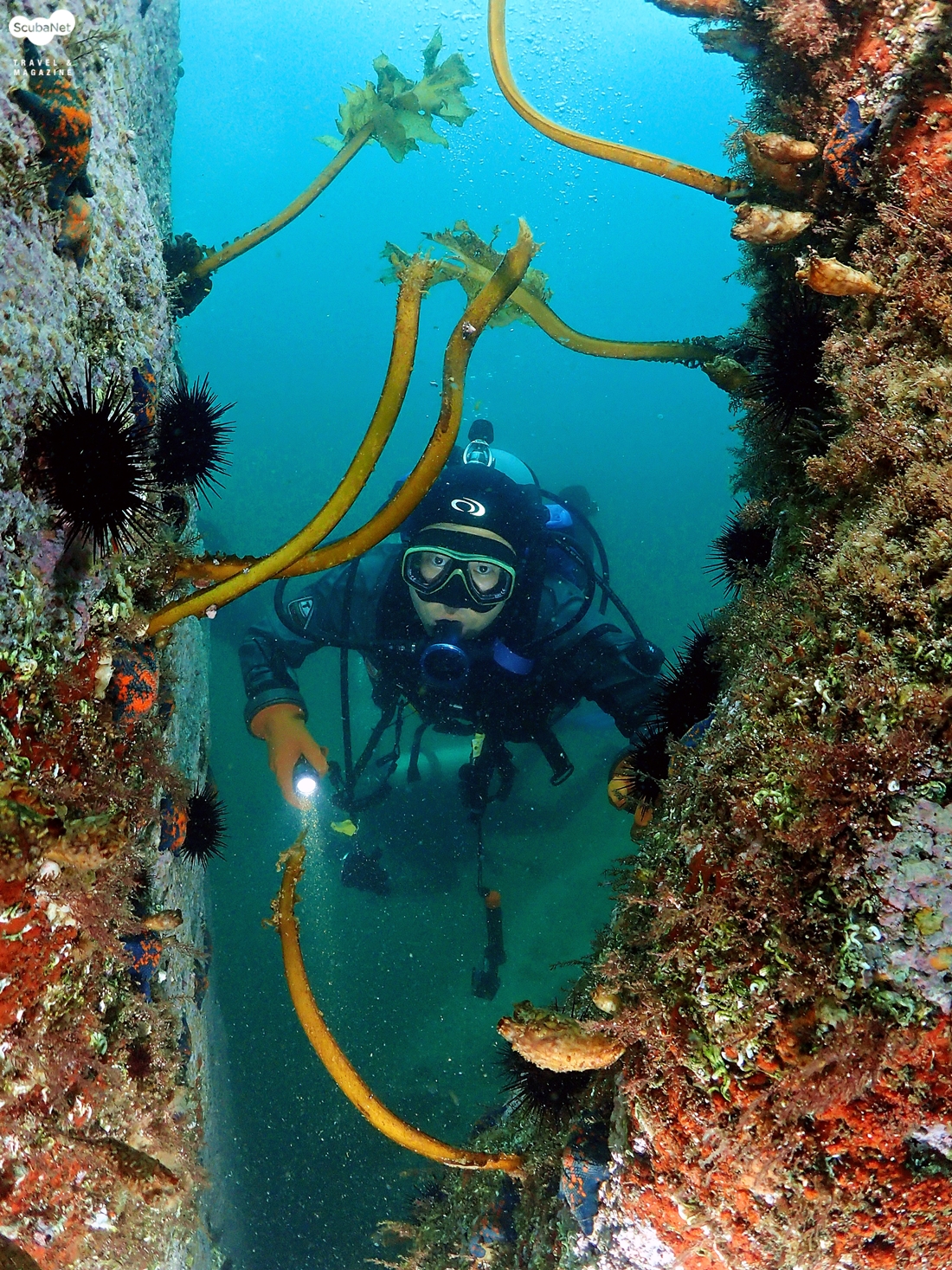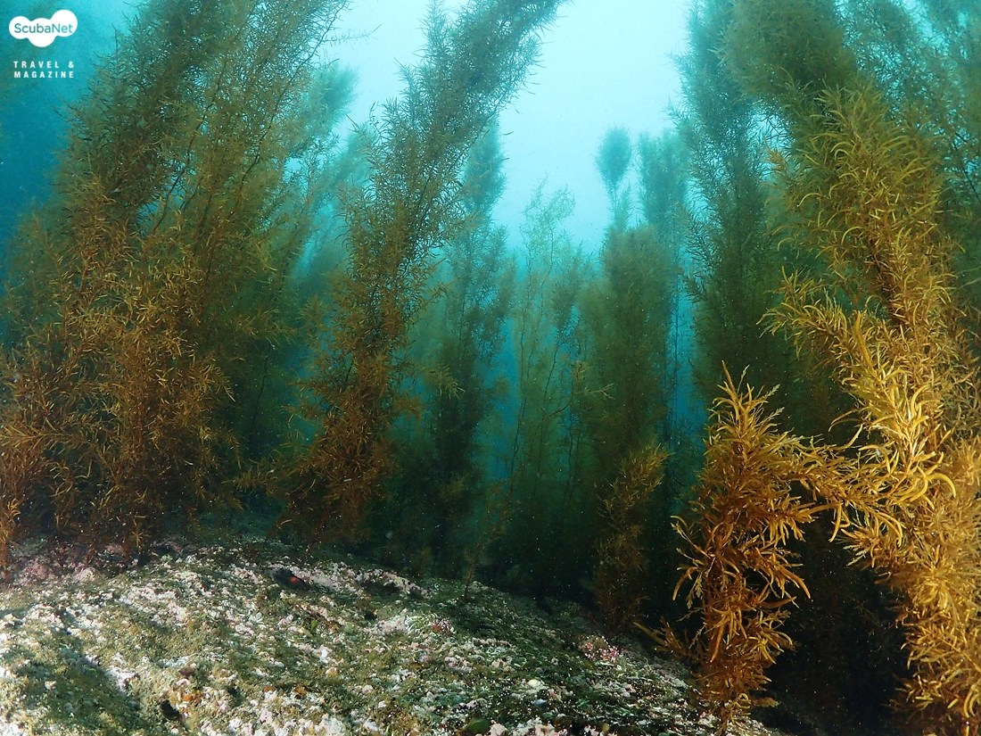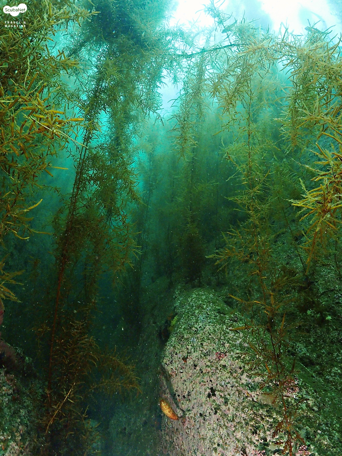 암반 사이를 지나가는 다이버 (신승태씨)1차 다이빙을 마치고 2차 다이빙은 ‘고인돌’ 포인트로 갈려고 하다가 모자반이 잘 자라 있는 곳으로 가자고 하니까 ‘소청봉’이란 포인트로 안내해 주었다. 바닥 수심이 10m도 채 되지 않는 얕은 수심에 평균 수심은 6m 정도 되는 곳이었다. 입수 하자 마자 한눈으로 물속 바닥이 다 보인다. 첫 다이빙보다 오히려 얕은 수심에서 시야가 좋다. 바위 사이에 크랙을 따라 가면서 유영을 하다 보니 우리는 어느새 모자반 숲 속에 들어가 있었다. 바닥에서 수면까지 쭉 자라나 있는 모자반 사이 사이를 돌다 보니 그 속에 숨어 있는 전복, 갯민숭달팽이, 소라 등등 다양한 생물을 만날 수 있었다. 잘피는 꽃을 피우려고 준비 중에 있었고, 작은 치어들은 해조류 속에서 몸을 숨기고 있었다.