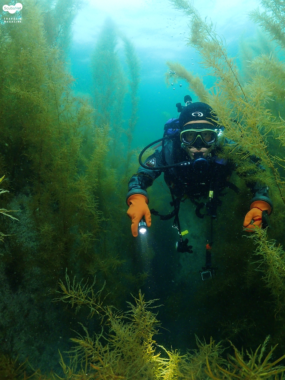 모자반 사이를 유영하는 다이버 (신승태씨)