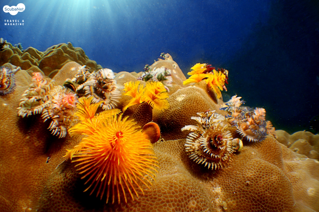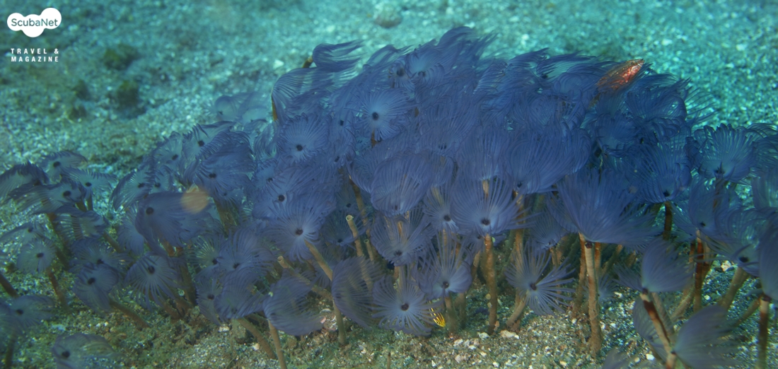 크리스마스 트리 웜의 군집을 광각으로 촬영하였다 가끔 열대바다 수중에서 다이버들의 눈을 현혹시키며 신기한 느낌이 들게 하는 생물이 있다. 필자는 여러 가지 벌레 worm 종류들을 보면 신기한데 그 중에 가장 흔한 것이 크리스마스 트리웜 Christmas tree worm과 튜브웜 Tube worm 등이 있다. 이들은 우리말로는 꽃갯지렁이라고 하면 되된다. 크리스마스 트리 웜은 깃털처럼 생긴 아가미를 활짝 펼치고 있는 모양이 크리마스 트리 같다고 해서 그렇게 이름이 붙었다. 또 다른 형태의 갯지렁이는 석회질이나 섬유질 관을 형성하여 바닥에 몸을 고정시키고 관 밖으로 아가미 깃털을 펼쳐서 조류에 떠다니는 플랑크톤을 잡아먹는다. 그래서 튜브웜, 관갯지렁이라고 한다.