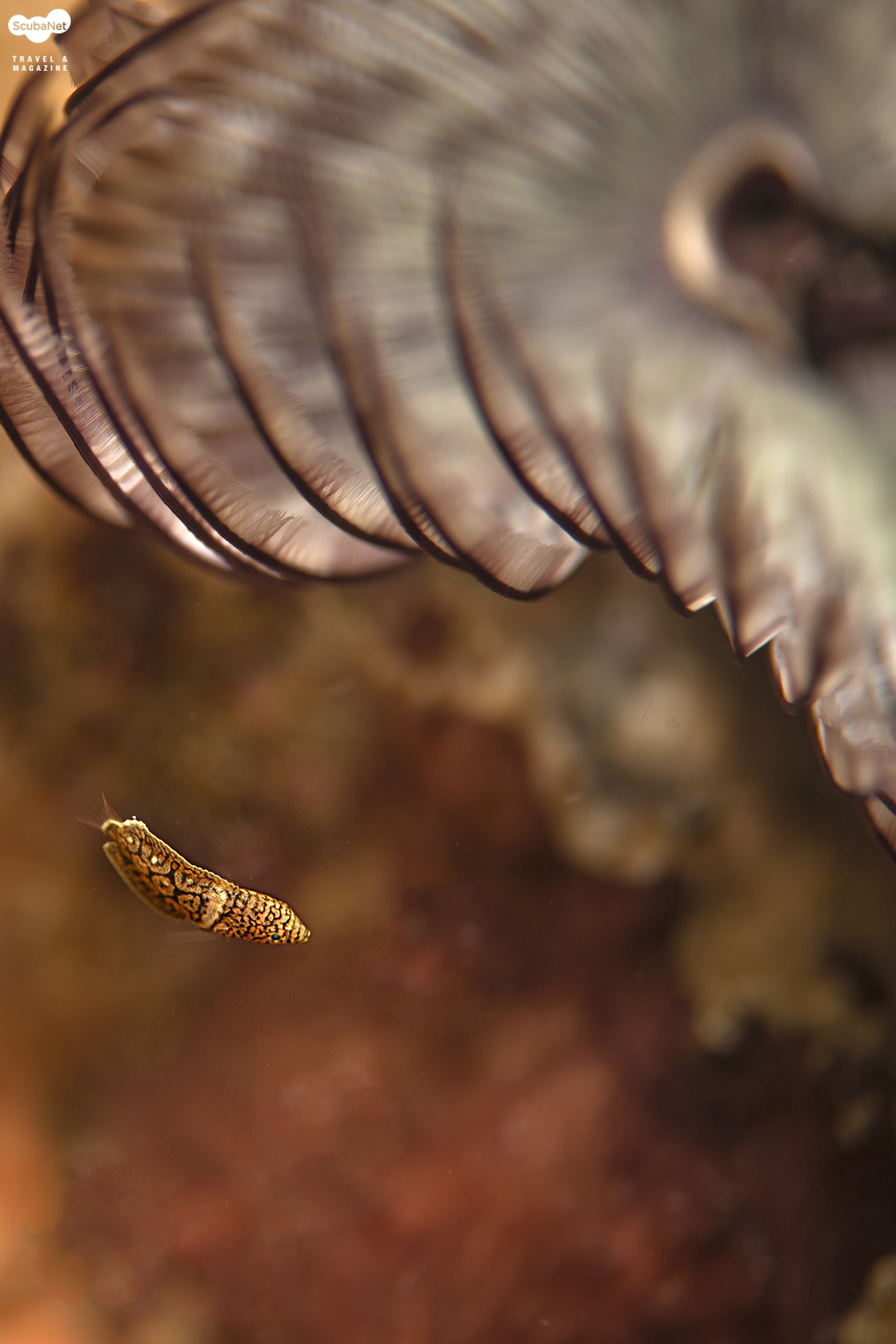 같은 피사체를 105mm로 촬영하였다. 4. 운이 좋아서 갯지렁이 주위에 주 피사체 생물이 존재한다면 가장 촬영하기 좋은 위치 그리고 가장 결정적 활동 peak action 기회를 잘 포착하여야 한다. 그러기 위해서 기다림이 중요하다.
