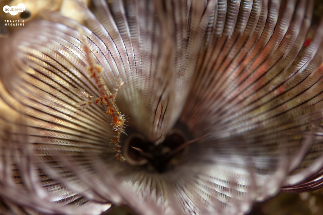 105mm 렌즈로 튜브웜 속의 고스트 파이프피쉬를 촬영했다.