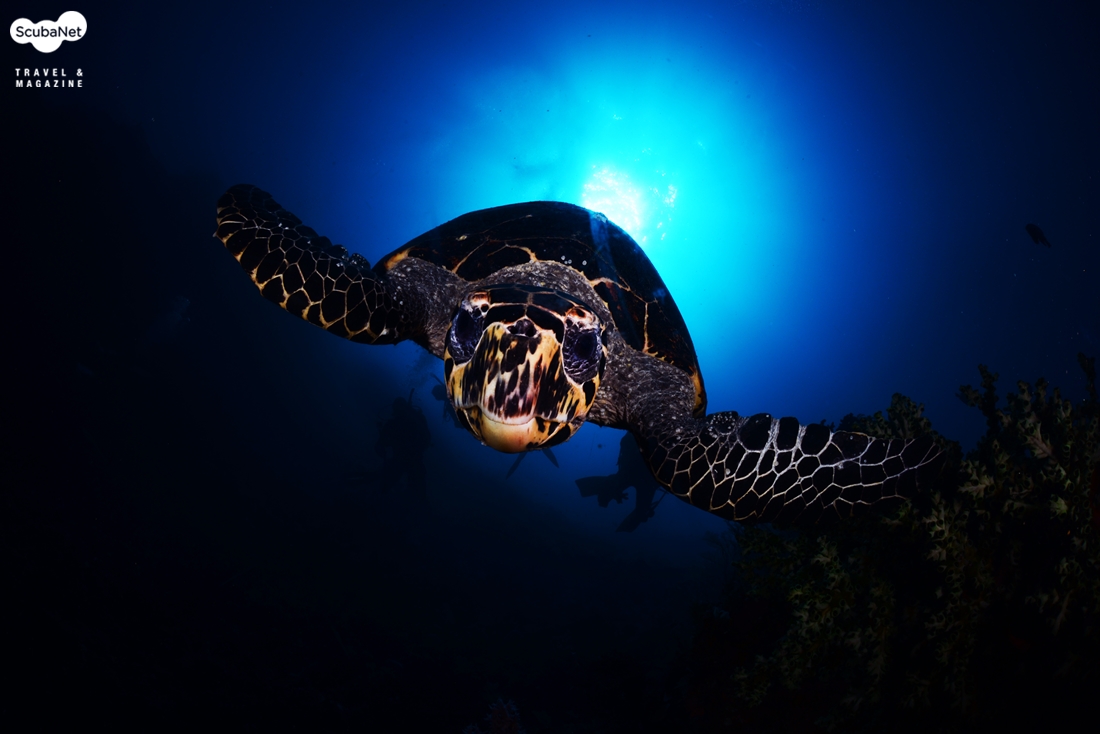 돔 포트를 먹이로 알고 접근하는 혹스빌 바다거북